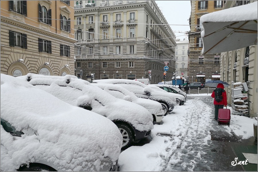 天有不測風雲,就這麼剛好讓二隻狼返航的這一天,遇到羅馬地區突如其來的暴雪襲擊,凌晨數小時的大雪讓羅馬地區的航空、陸地交通大亂鬥,是羅馬近年最猛烈的一場冬雪,考驗老狼的應變能力以及二隻狼的禦寒能力。老狼竟然異想天開帶小狼去特米尼火車站最近的警察局求助義大利警察,義大利警察杯杯當狼馬是愛理不理,條子的態度有如街上的冰雪。二隻狼在厚厚的雪地裡死命的拖著行李箱來回一趟警察局、火車站,方體會了北國居民的冬季大雪所帶來的不便,不是生長在美麗寶島、四季如春的台灣狼所能想像與不便。