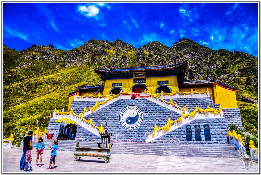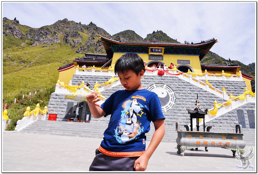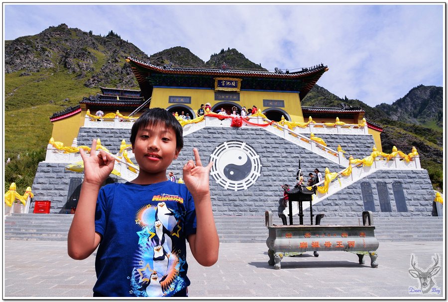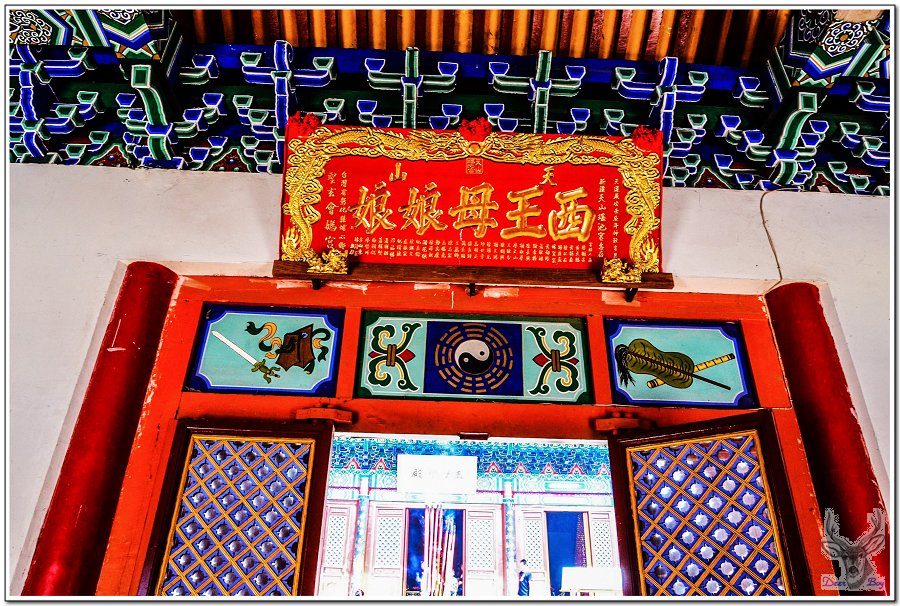在瑤池宮,導遊解說倉頡造字,這個『仙』字的由來就是現在的位置,首先看左下角山谷和天池水面形成的『人』字,再加上對面半山腰天然形成的『山』字成為『仙』字,所以這裡靈氣特別強,道教『瑤池宮』供奉西王母娘娘,是全國道教的祖廟,……..