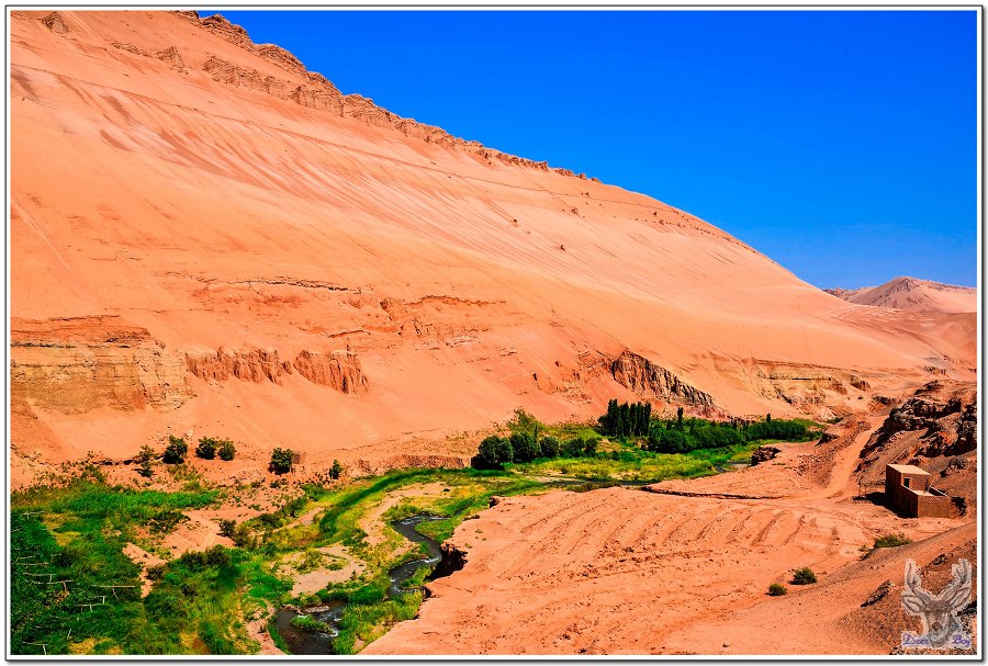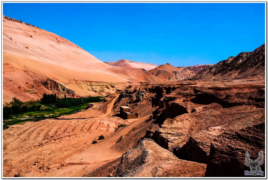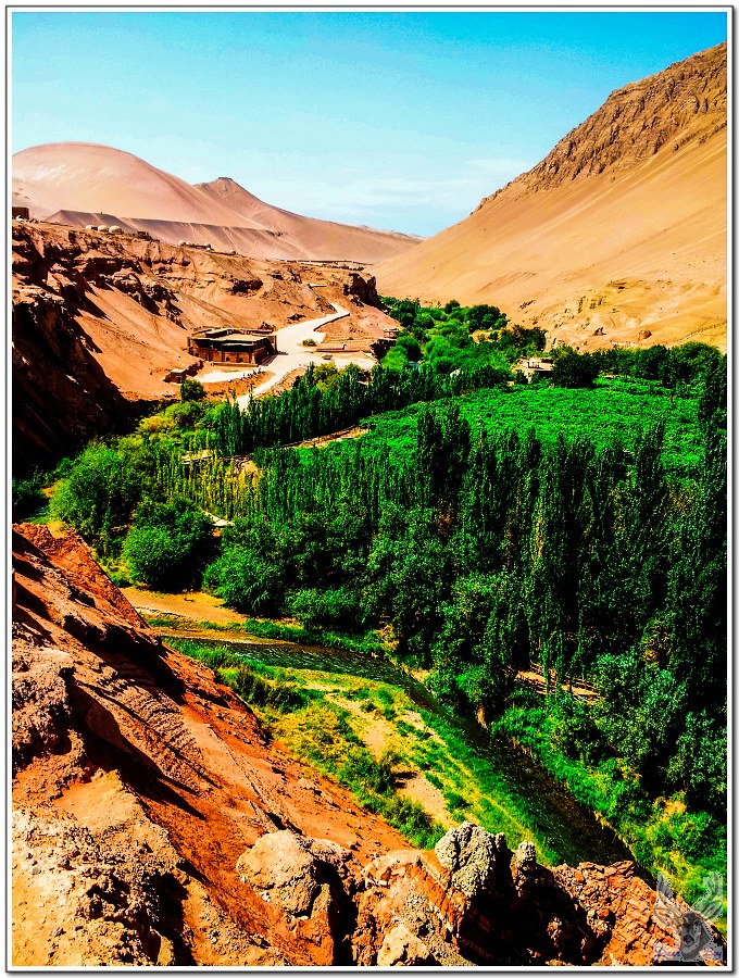 新疆地處乾燥沙漠地帶,水是非常珍貴的資源,早期新疆人發明了『坎兒井』,由豎井、暗渠、明渠、澇壩(積水潭)四部分組成。從山上的雪水引流由坎兒井擔任輸送系統,坎兒井在地表以下數米甚至10幾米下方,避免水分的蒸發流失,因為取自高山雪水,流通坎兒井的水溫終年冰涼,有些居民會在水渠上方搭建木板平台,夏天在平台上睡覺、休息是非常暢快的享受!