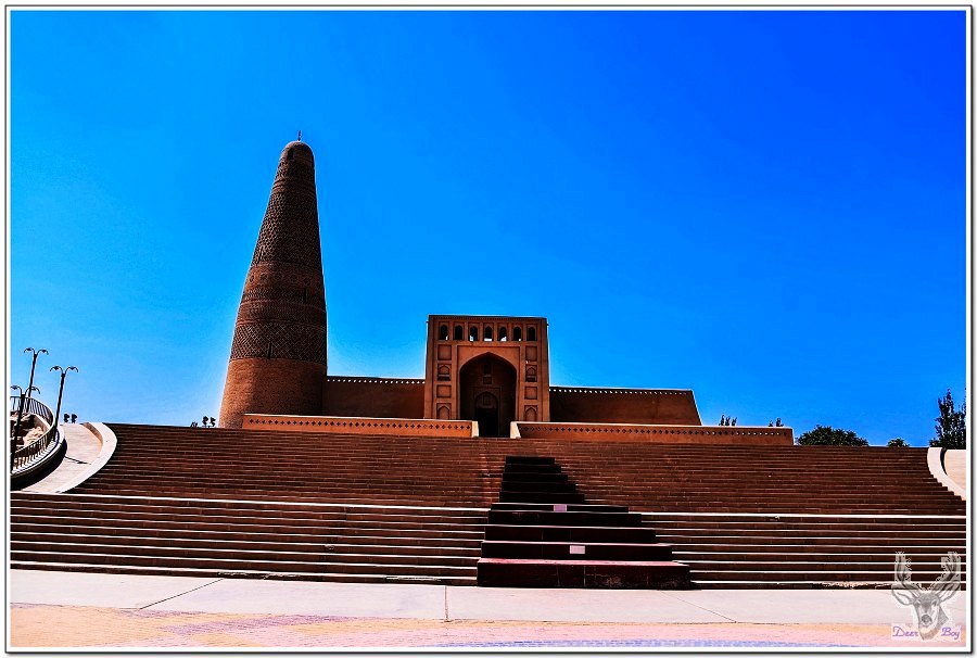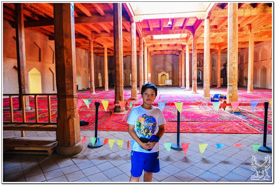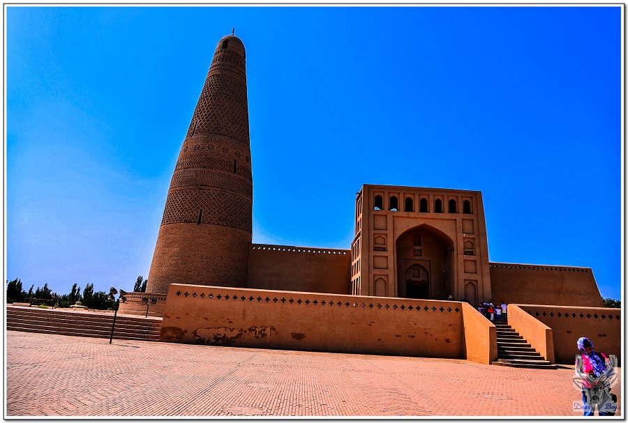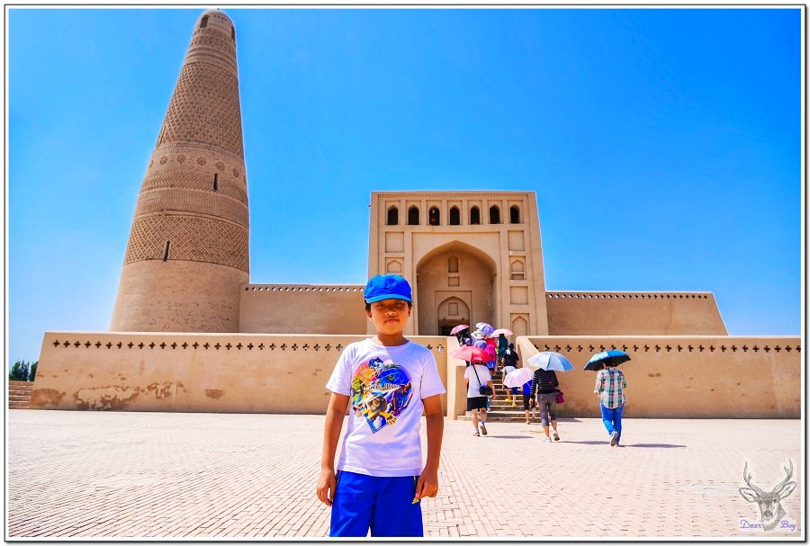 參觀蘇公塔,是一座回教清真寺!老灰狼心愛的EiDER Gore-TEX帽子在嫩江回哈爾濱的長途巴士上搞丟了,Eric一向不喜歡戴帽子,所以都用他的Nike Gore-TEX帽,吐魯番這兩天白天超過攝氏50度,今天他跟我搶帽子!