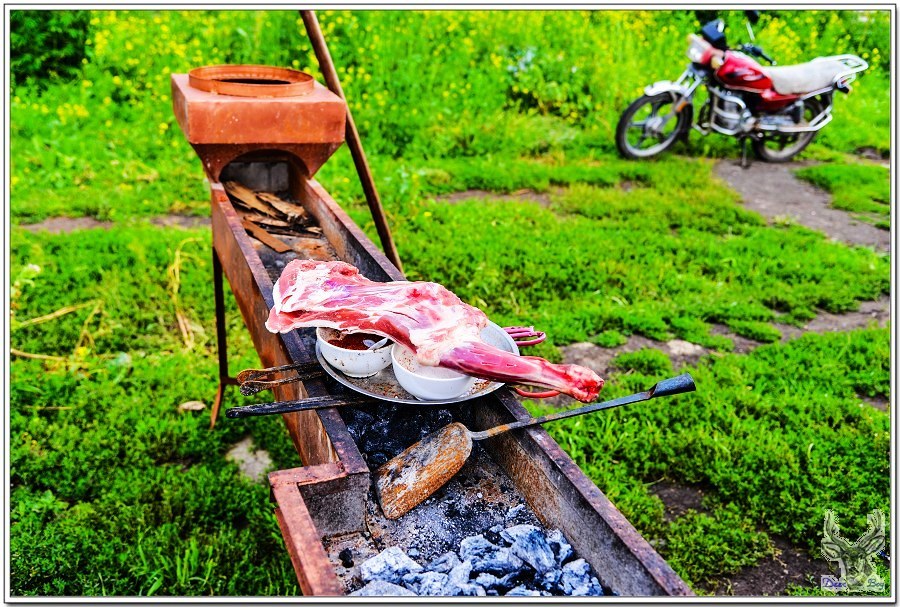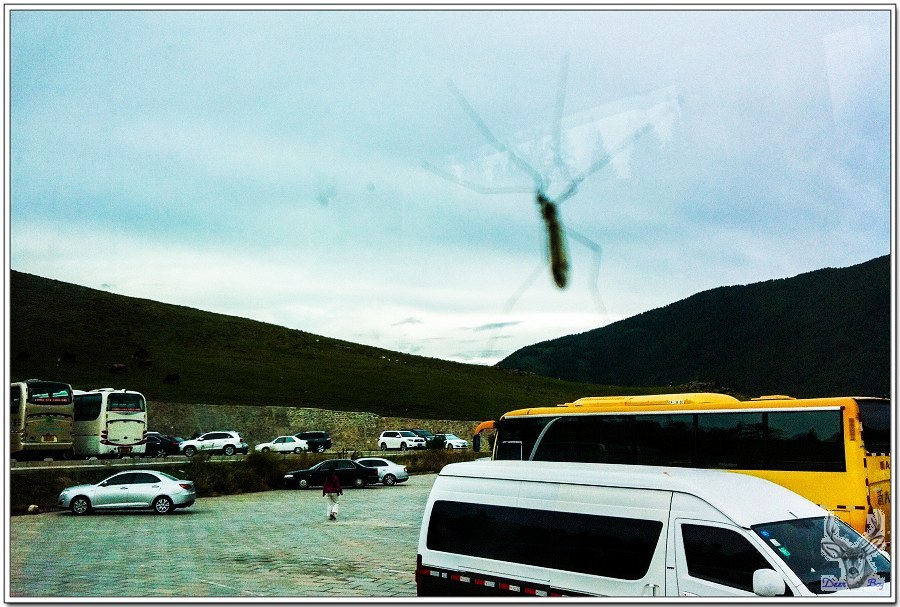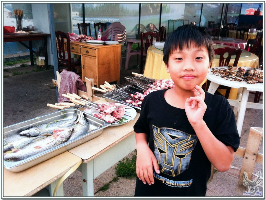 沒想到北疆也跟黑龍江北極村一樣蚊蟲超級多超級狠,老灰狼的防蚊液放在大行李箱,蚊子大軍真的會讓人抓狂,這一天已經用掉半瓶白花油,在遊覽車的玻璃上停下來一隻餓狠很的超大蚊子!結束喀納斯國家地質公園後來到今晚住宿地〜賈登峪,在這用餐,餐廳外頭販賣烤羊肉,因為是觀光區,讓Eric排隊買!