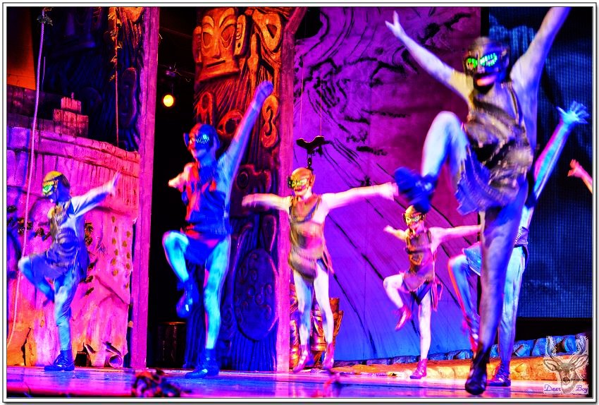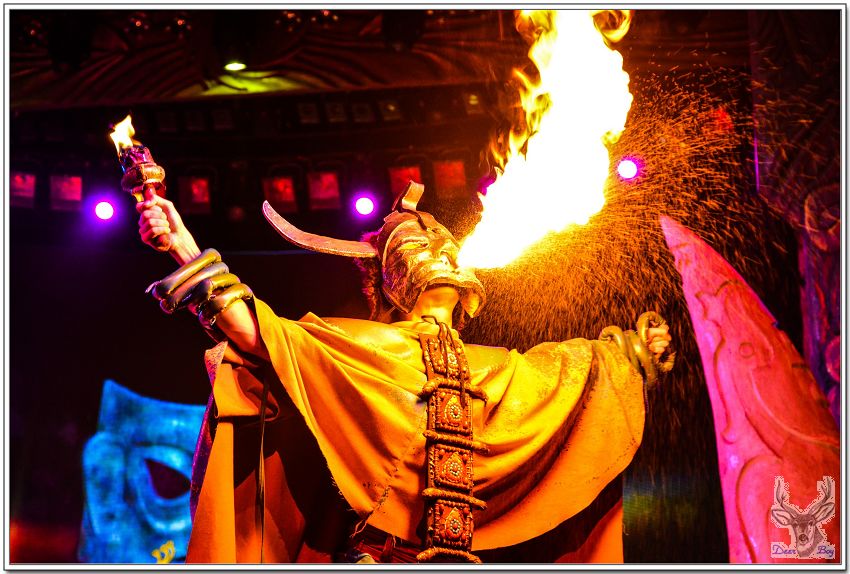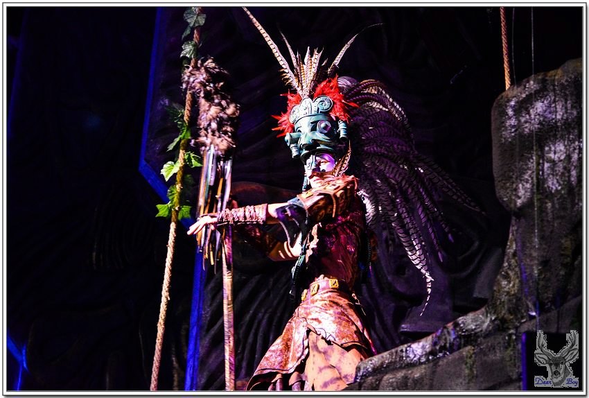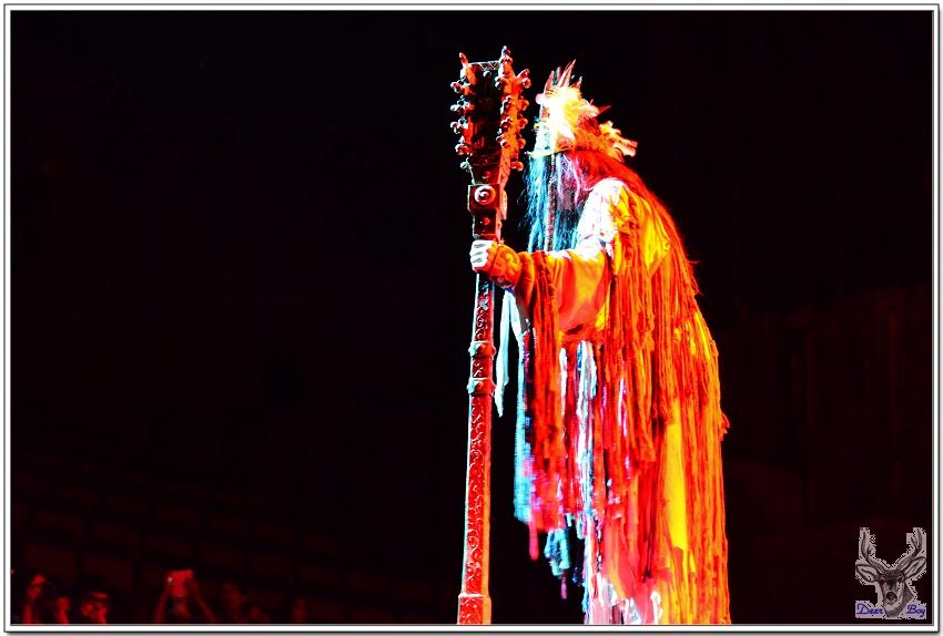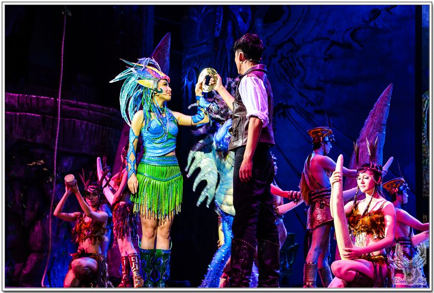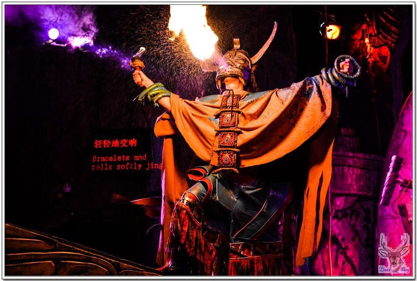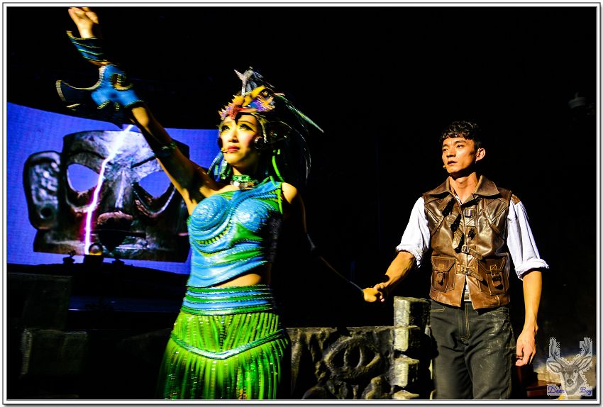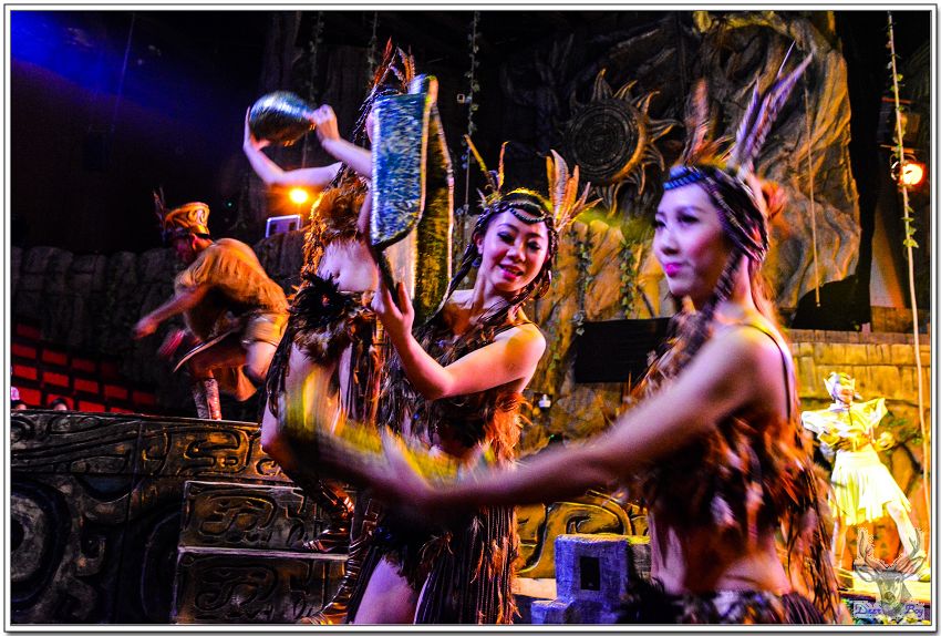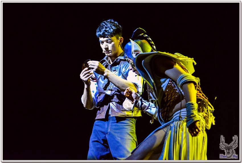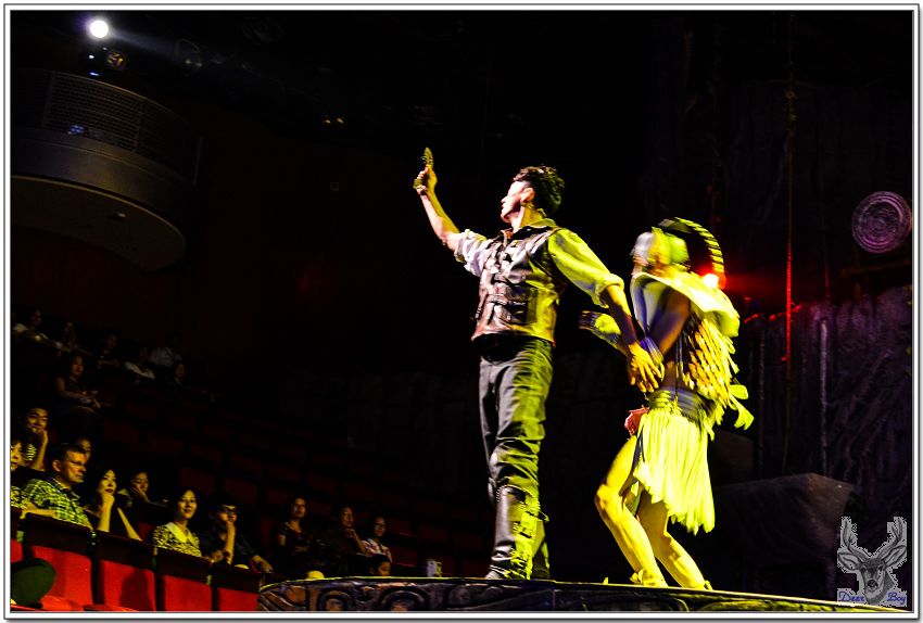 女演員手拿著類似犀牛角的道具,像是婆羅摩洲土人用的『懶叫套子』,孩子們當然看不懂,老灰狼臉上三條線!