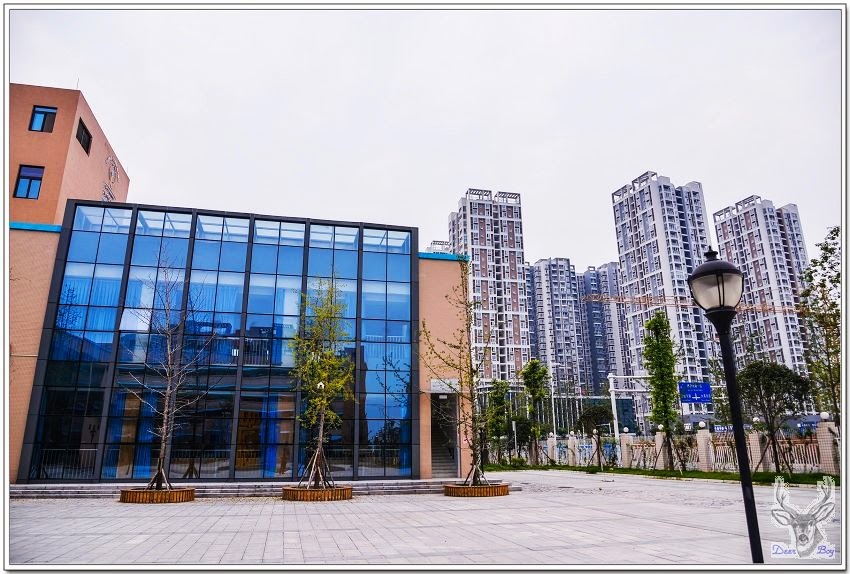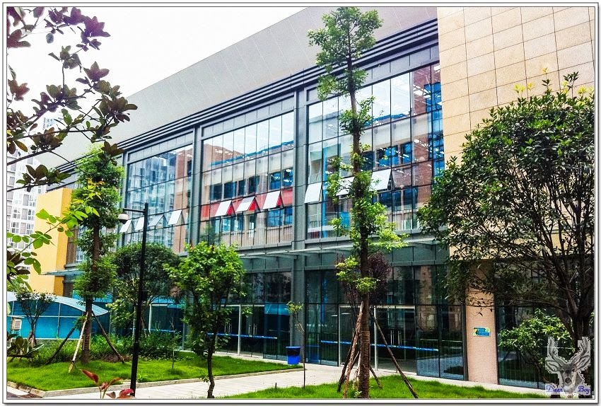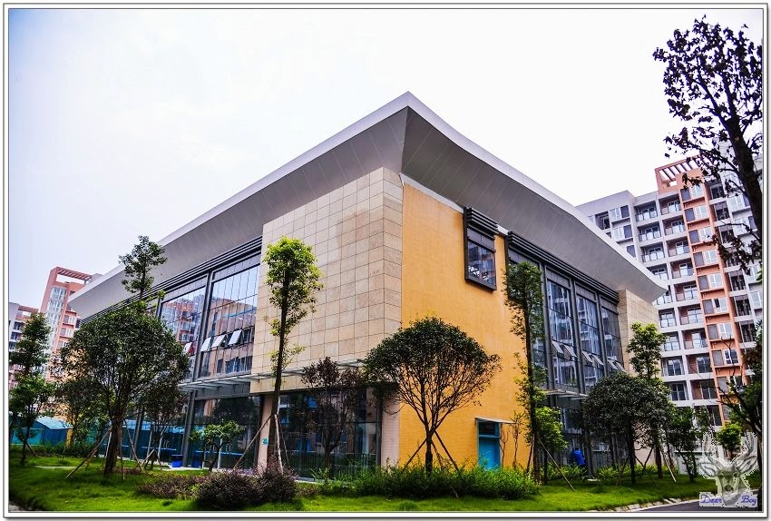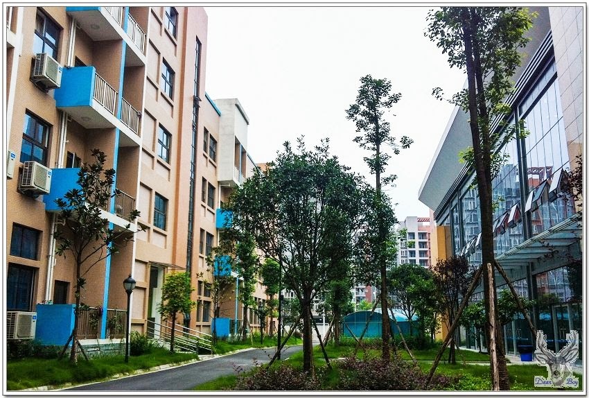 右手邊是教室,左側是體育館、游泳池!