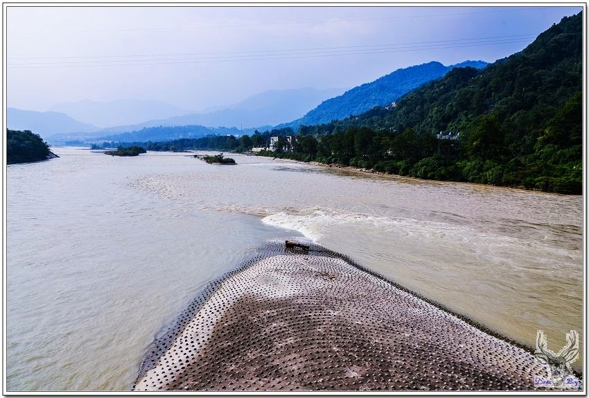 寶瓶口在照片的遠處(岷江上游端)〜湍急的岷江經都江堰的魚嘴分流分沙之後延著人字堤到了寶瓶口!分水魚嘴(照片中宛如一條魚形工事),是都江堰第一個工程,李冰父子在湍急的岷江之中建造一個小島,將岷江分流為二,內江和外江(地圖左邊是西,右邊是東),魚嘴的作用是46分流,洪泛期河水4分流進內江,6分到外江排洪。28分沙,魚嘴淺灘將流速較緩的岷江水導入外江進行江水吐沙淨化!