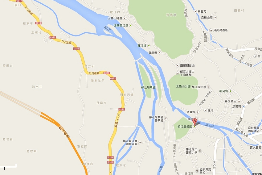 ~由地圖上看,可瞭解岷江遇到寶瓶口和分流魚嘴彷彿麵團進了製面機分流成麵條!