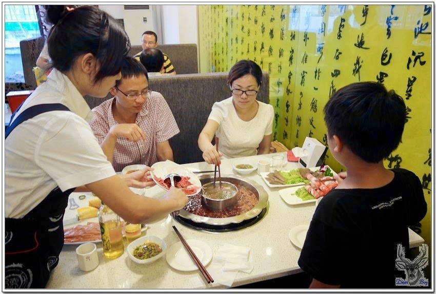 呂老師說他們住郫縣,離成都市10多公里,因為成都市區交通規範很嚴格,呂太太多年前曾經開車進市區過幾次,她說在成都市區開車太緊張、太麻煩,車上的導航系統沒用過幾回,讓呂老師操作的手忙腳亂。禁止左轉的號誌太多,感覺呂太太有點心慌慌,我們盡量拉輕鬆話題,讓呂太太寬心。 呂老師安排了『德莊火鍋』晚宴。他介紹『德莊火鍋』是屬於重慶火鍋的連鎖店系列,因為知道她我們不吃辣,『德莊火鍋』是改良式口味,沒有重慶火鍋那麼麻跟辣,所以幫我們準備了鴛鴦鍋,來到成都就小小嚐試一下麻辣鍋,真的不行就吃白鍋吧!