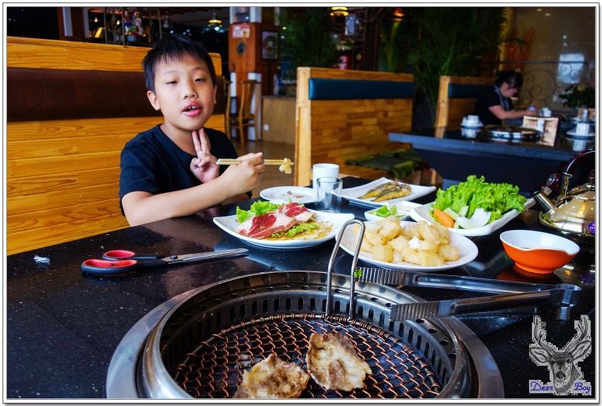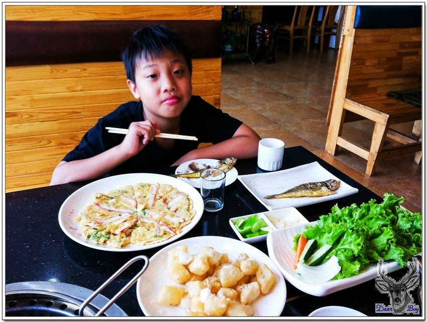 餐廳裡頭沒啥生意,外場經理、服務員全都是中國籍,看來我們確實選錯了餐廳,反正Eric有烤肉就很高興!點了2尾廚房烤的黃魚、牛肉、海鮮煎餅和一份糍粑!