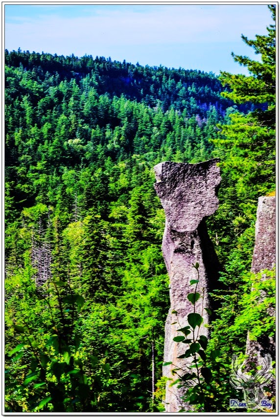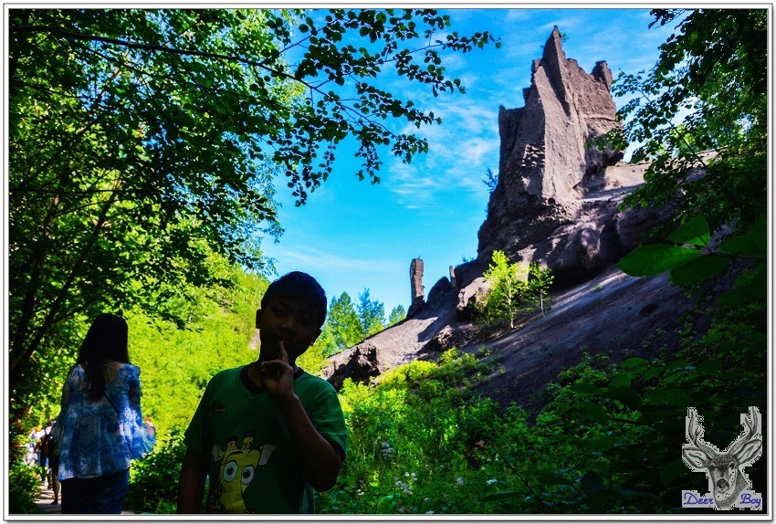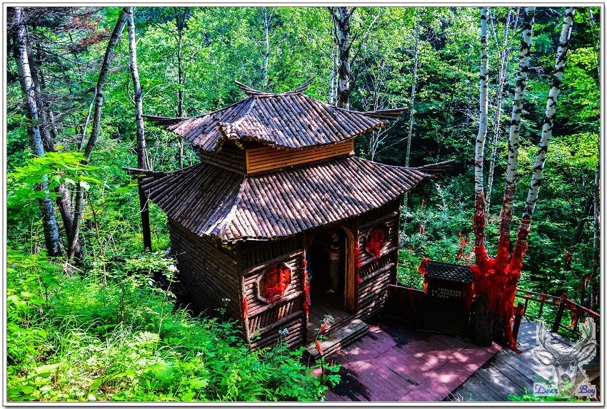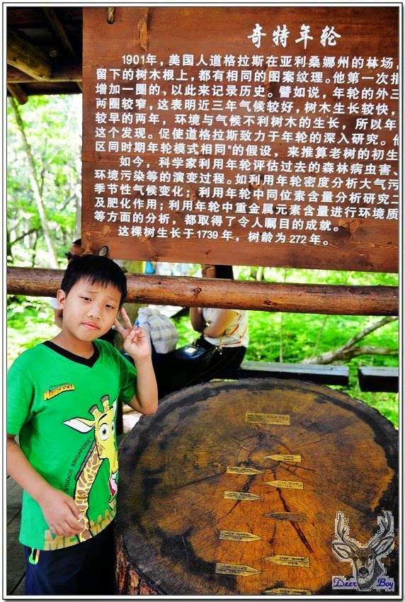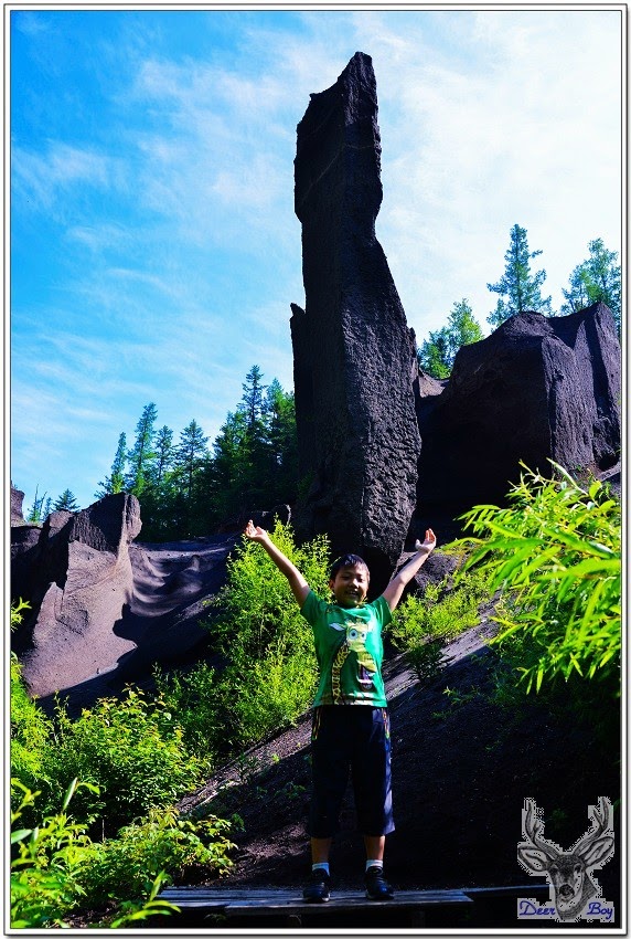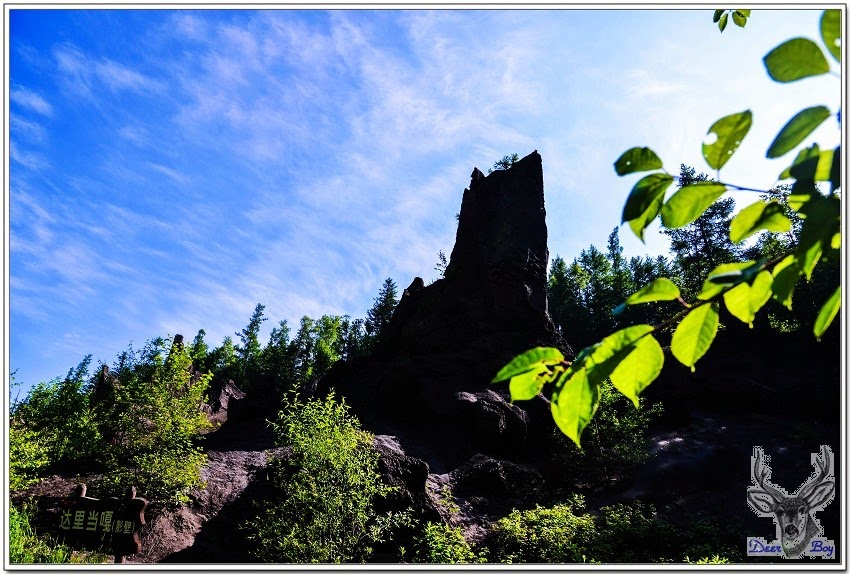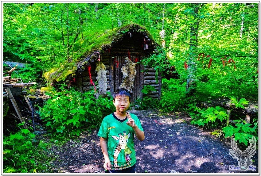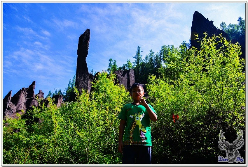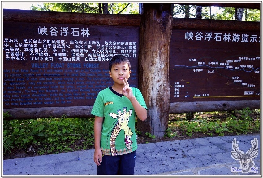 Eric轉述地陪解說這是一棟獵人小屋!看解說牌稍微知道『浮石林』是長白山火山爆發遺留的岩漿經千萬年雨水沖刷後造就了各種奇形怪狀的地形地貌,這些怪狀奇岩都很脆弱,碰不得,所以遊客只能走在木棧道上欣賞!