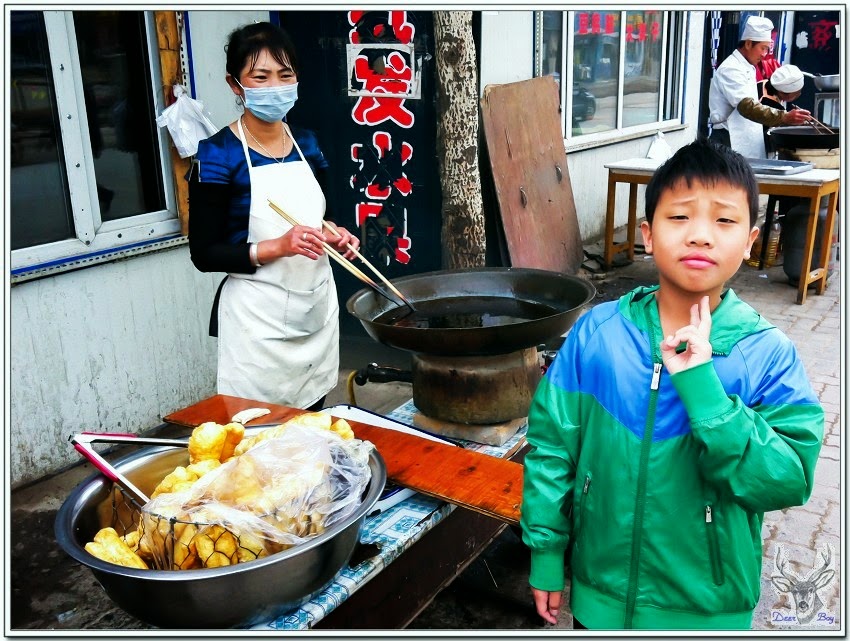 拎回早餐到酒店大廳享用正宗『中國北極村早餐』!雖是現炸的油條,形狀扁扁長長的,口感像是炸饅頭,跟台灣的油條風味、口感完全不同,是不是沒有加硼砂的關係啊?反正這不鬆、不脆的油條Eric咬了一口就不吃了,還好他肯吃油炸糕,類似台灣的芝麻球,裡頭有紅豆餡,雖然也是現炸的,口感軟趴趴的,小鬼頭再嫌不好吃,不吃就得挨餓啦!