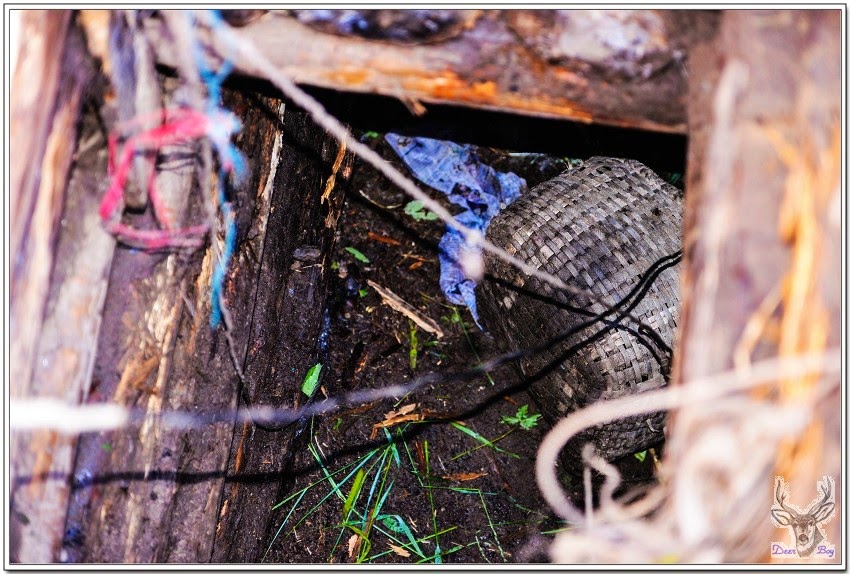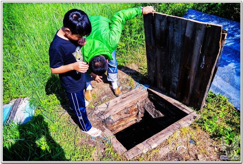 走到農莊外圍,曉宇在草堆中搬走一塊薄鐵皮,將木板掀開就是地窖了,瞧地窖的木板蓋子都還有一層霜,真的是從冬天凍到現在!地窖約莫超過4~5米之深,裡頭黑壓壓的,我用閃光燈拍了一張,曉宇說底下剩下幾打冰啤酒和鮮魚,相當於冰箱的冷藏室的功能!