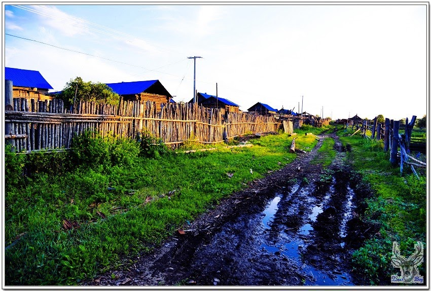 到了村尾穿進小村落的副線道,因為被籬笆層層擋住,沒辦法穿越菜園到主線道路,泥巴路黑的像濁水溪石硯,積水處的爛泥巴就像台灣的仙草或龜苓膏了,所以黑龍江雖然江水清新乾淨,從水面看起來就是黑褐色,東北的土地實在太肥沃了!