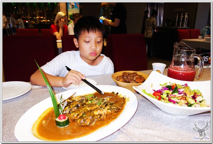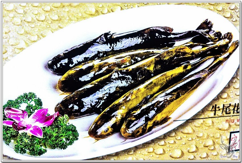 原來2009年暑假老灰狼在張家界旅遊,彭導經營大餐廳的朋友招待我很珍貴的岩魚就是這款魚,這裡叫『牛尾花』,時價,這款魚超好吃,於是詢問服務員多少價位,吼,果然不便宜,那就上4尾,不能點太多!再配『信譽大伴菜』一份綜合青菜和一份Eric要點的『勞模紅燒肉』(46元)!