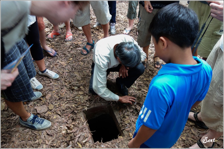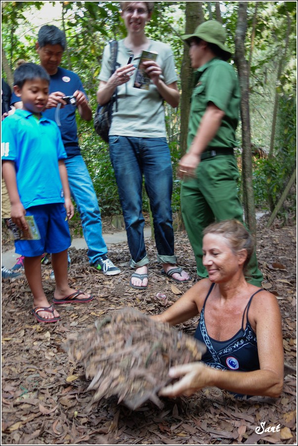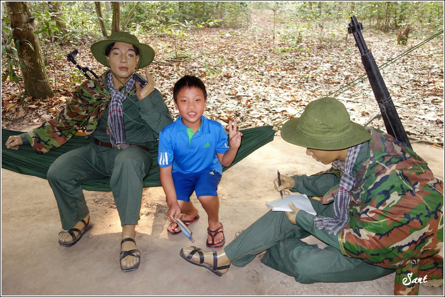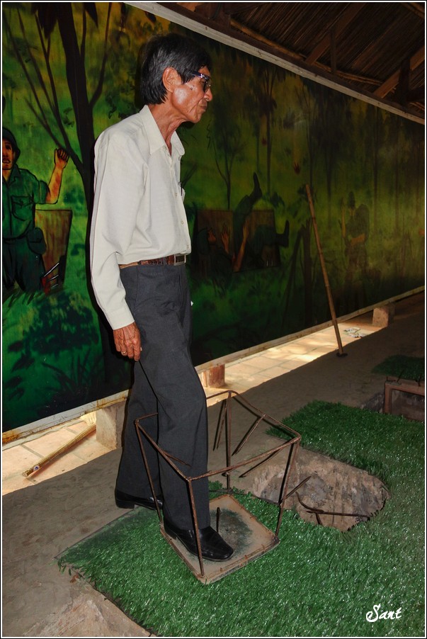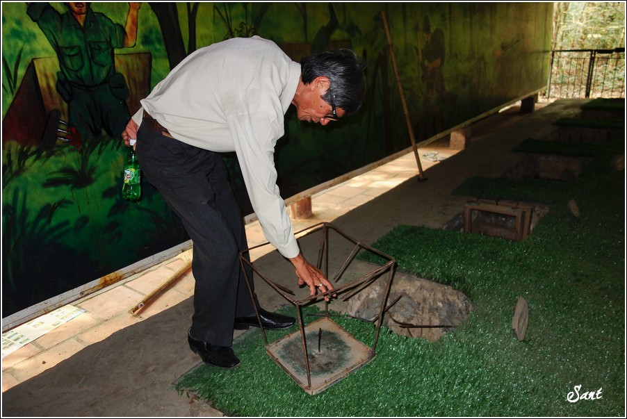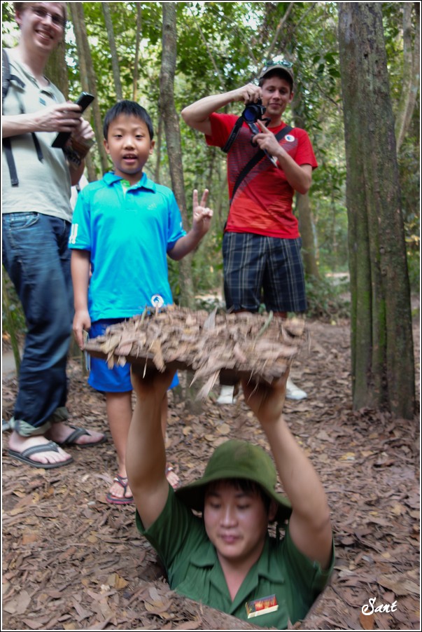 團員們回到現實地面有如重生,大夥都讚嘆有如迷宮一般的地道,因為越南人身材比較瘦小,在地道中有如鑽地鼠般靈活矯健,有時,越共會引誘美國大兵鑽入地道,美國大兵塊頭大,哪能鑽多久,很容易卡在裡頭前進不得,想往後逃又被後方大兵堵住,這下遭殃啦,當越共收集這些傻美差不多時,就封住入口,丟手榴彈請美國大兵們上天堂去!