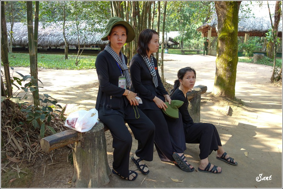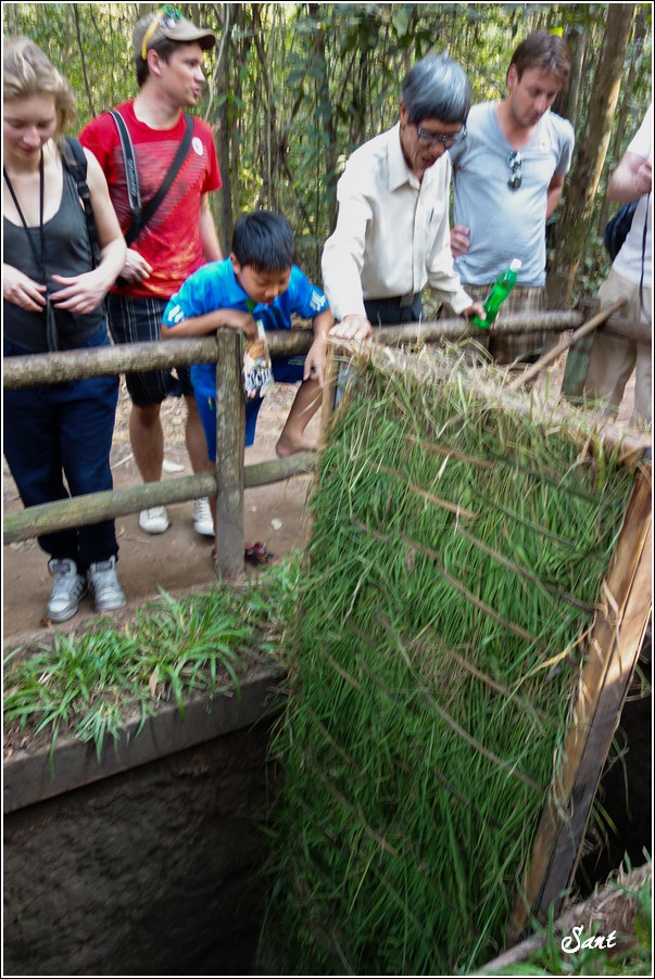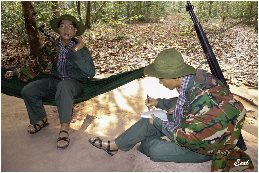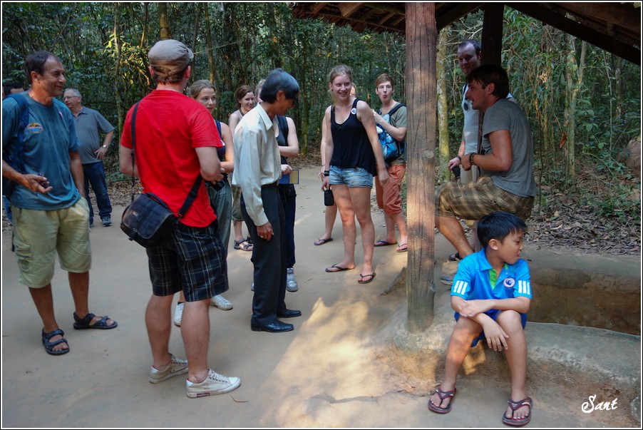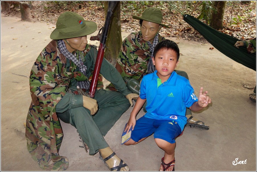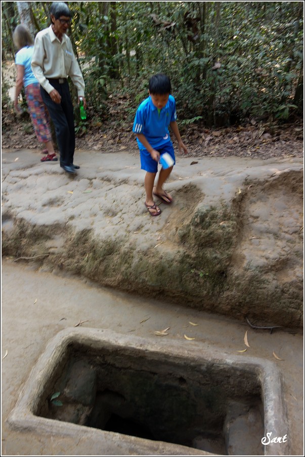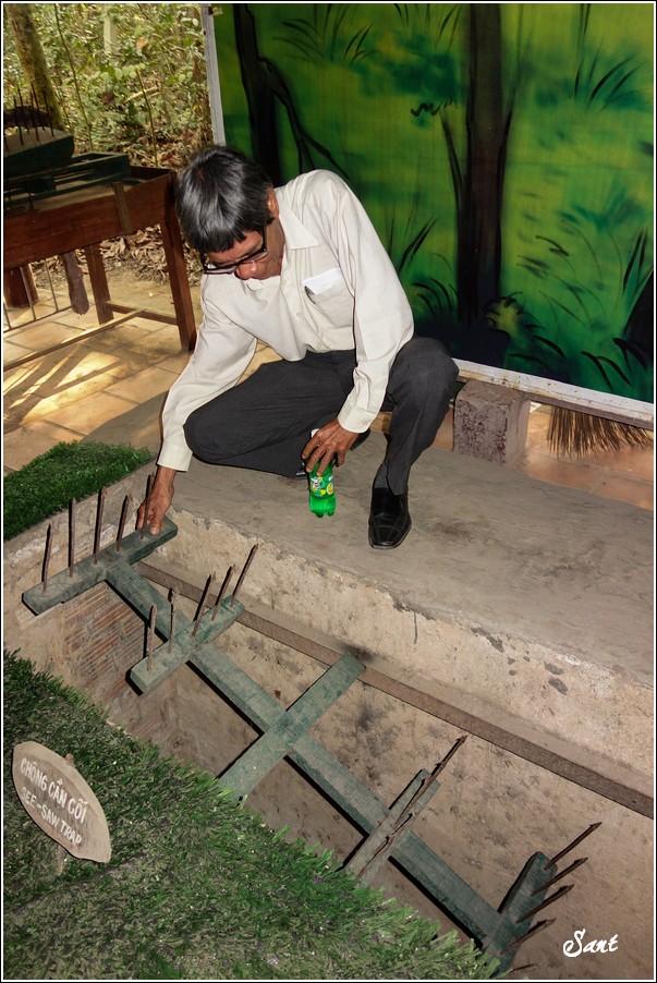 團員們回到現實地面有如重生,大夥都讚嘆有如迷宮一般的地道,因為越南人身材比較瘦小,在地道中有如鑽地鼠般靈活矯健,有時,越共會引誘美國大兵鑽入地道,美國大兵塊頭大,哪能鑽多久,很容易卡在裡頭前進不得,想往後逃又被後方大兵堵住,這下遭殃啦,當越共收集這些傻美差不多時,就封住入口,丟手榴彈請美國大兵們上天堂去!