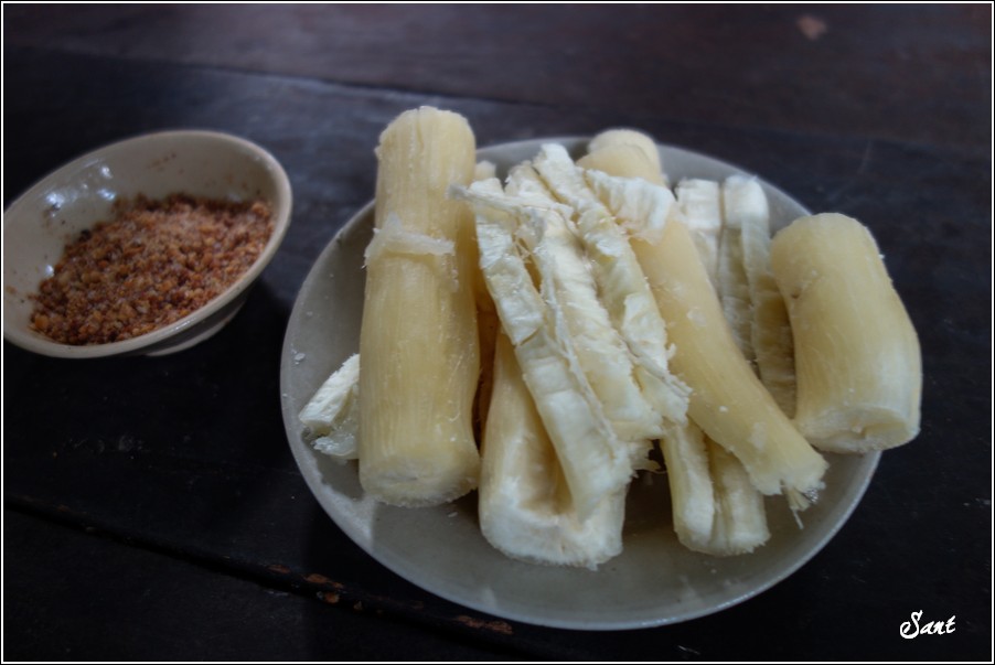 在涼亭休憩時,園方請我們嚐嚐當地的一種重要農作物~樹薯,直接水煮熟之後沾花生糖粉,台灣也有生產,傳統市場有賣,對於老外就是一種全新的體驗。