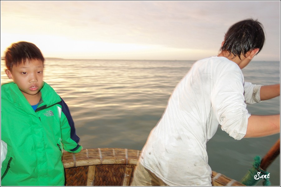 站在圓形的竹簍小舟令狼驚心動魄,漂在海面上前後左右加上下劇烈搖晃,還好早餐沒塞太飽,否則晃二下就能把胃裡的早餐噴到海裡餵魚去,演出餵魚秀。