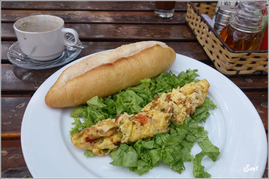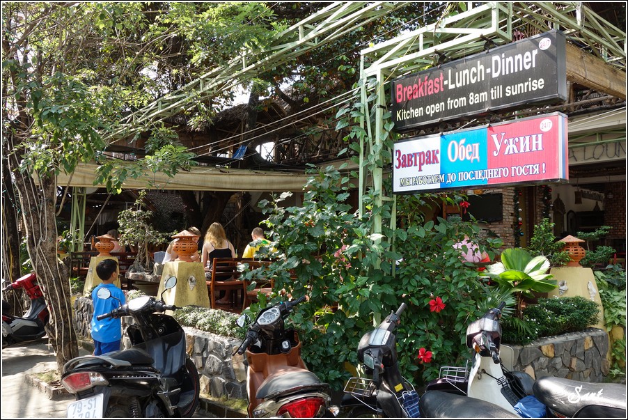 ★ Tran Phu Street:很好找,就在芽莊海灘上,在LOUISANE旁邊,白天是餐廳,晚上變成當地最紅的舞廳。也是海景無國界料理餐廳,看著海景點餐真是胃口太開,我中午去點了Breakfast Set,豐盛的兩份蛋、可頌、薯餅,配上鮭魚或培根,兩個人享用都夠了,配上杯香甜的越南冰咖啡,都可以混半天了,我花了約100,000d。