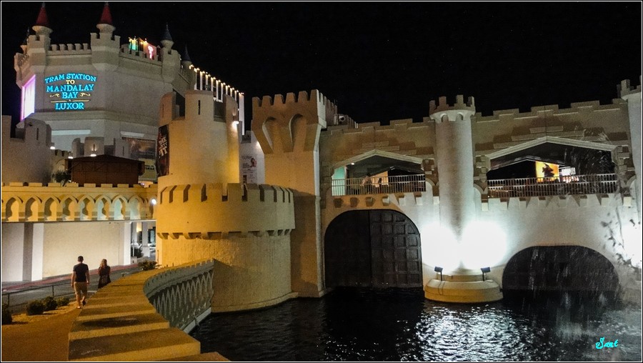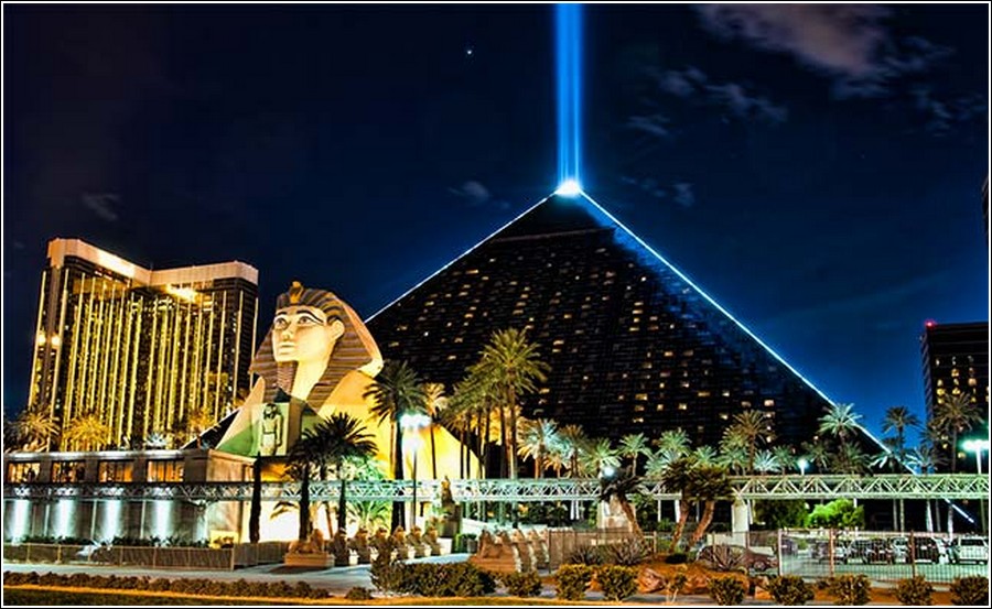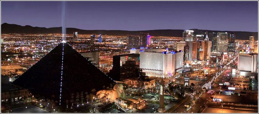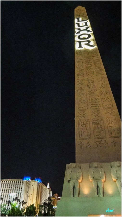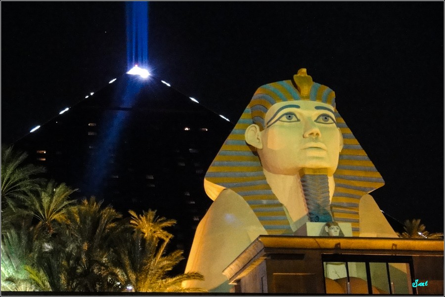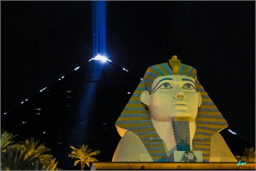 因為光線反差太大,沒有靠單眼相機搖黑卡是拍不到Luxor路克索飯店的金字塔型外觀。 金字塔的上端是百萬瓦燈光直上天際。