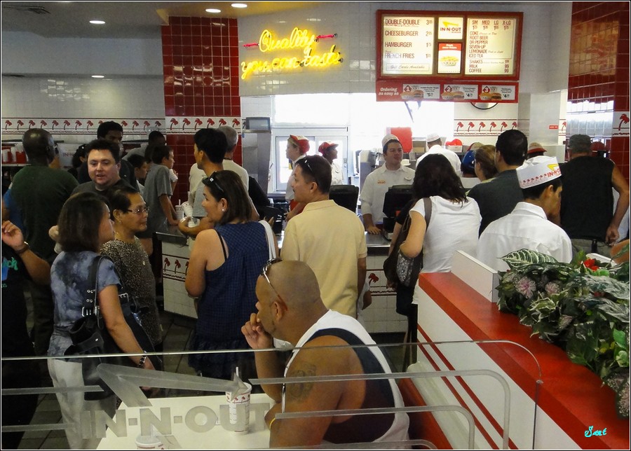 雖然大排長龍,因為出餐速度非常快,等候的客人都很興奮,不會不耐煩,櫃臺唱名、叫號,被點到號碼的老美像是中樂透一般大聲歡呼。