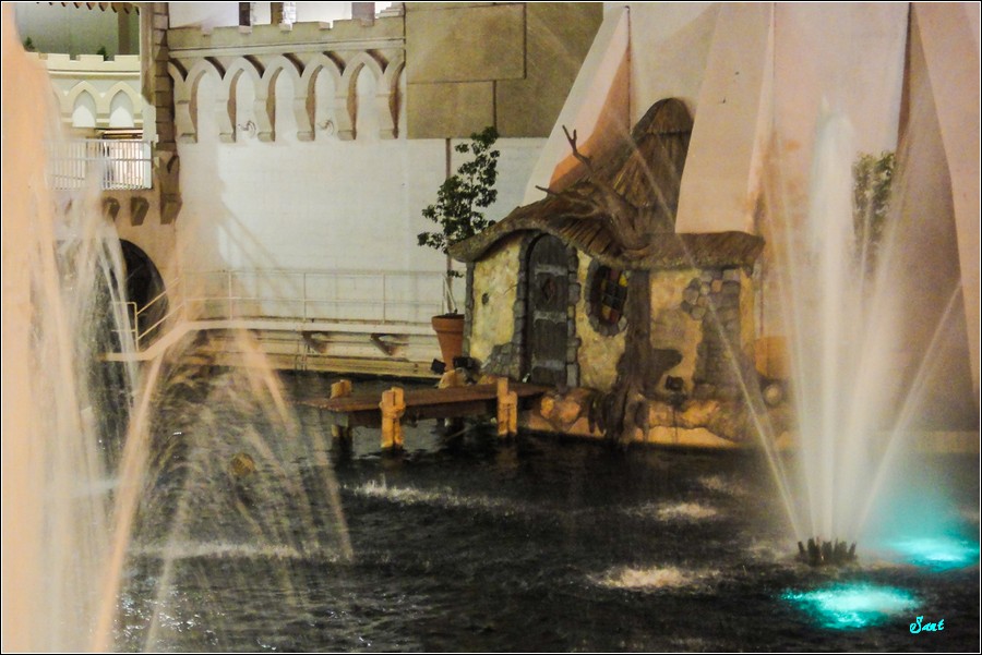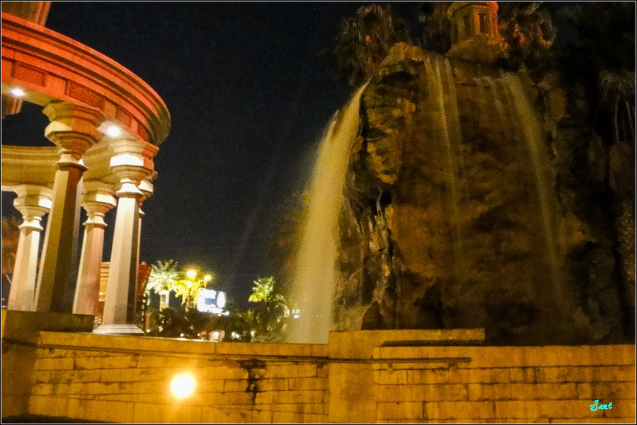 老狼1996年迷路賭城之夜,迷路時有經過這裡,當時這個噴水池剛好上演王子屠龍記,噴火龍從中間那個木門竄出來,口吐著烈火吼吼叫,王子從中間小門出現,手拿石中劍把火龍一刀斃命,贏得在場人山人海的觀眾一片安可叫好,如今已經停止免費演出。