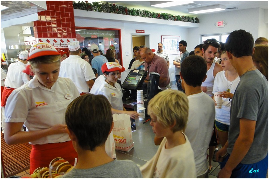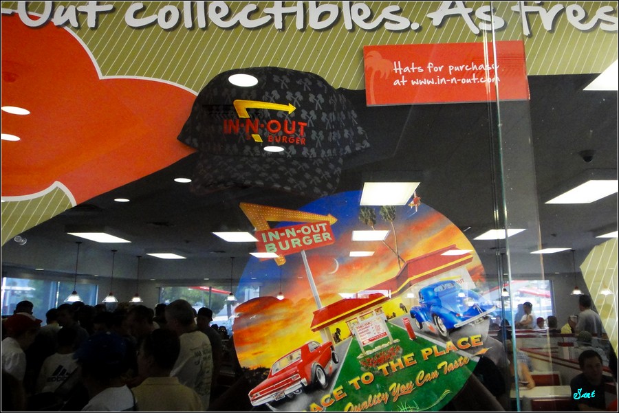 IN-N-OUT餐廳裡頭人潮洶湧,生意滿滿滿,餐點只有3種漢堡可以選擇,有販售二隻狼都愛喝的櫻桃可樂,太棒了!