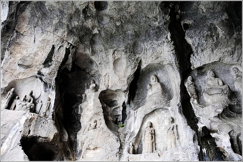 靠江畔的石崖上雕刻著不同時代的神像和字碑,有一巨型石柱,下方有如刀切細縫,將石柱一切為二,相傳是『伏波將軍』的試劍石。