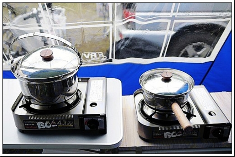Eric第一次在露營場擁有自己的卡打車,很開心、努力地在騎喔! 漂亮的鹿牌鍋具配上目前市面上火力最強的『環球RV』代理日本4.1 KW卡式瓦斯爐,不挑瓦斯罐,4.1 KW火力夠猛,真正讚!