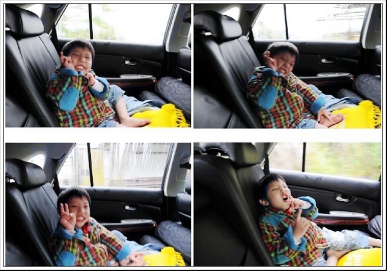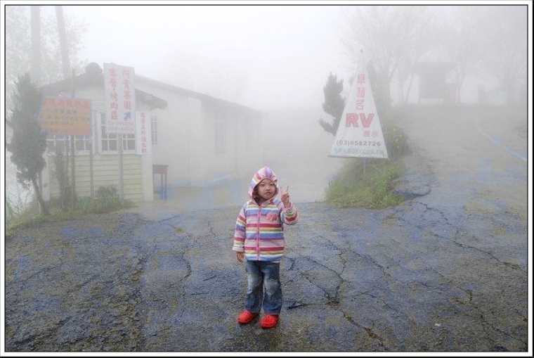 第二天早上,本來要帶Eric進去營地隔壁的『山上人家』參觀,因為霧水氣非常重,幾乎等於下小雨。 據不少朋友表示,裡面的環境、氣氛不錯,用餐品質普通,因為天候不佳,所以小紅帽不進去,在大門口幫Eric拍照,顧大門的阿伯問我們要進去嗎,我說不進去,他就起身趕我們離開,我才懶得理他,顧門卒子跩什麼跩!
