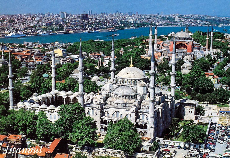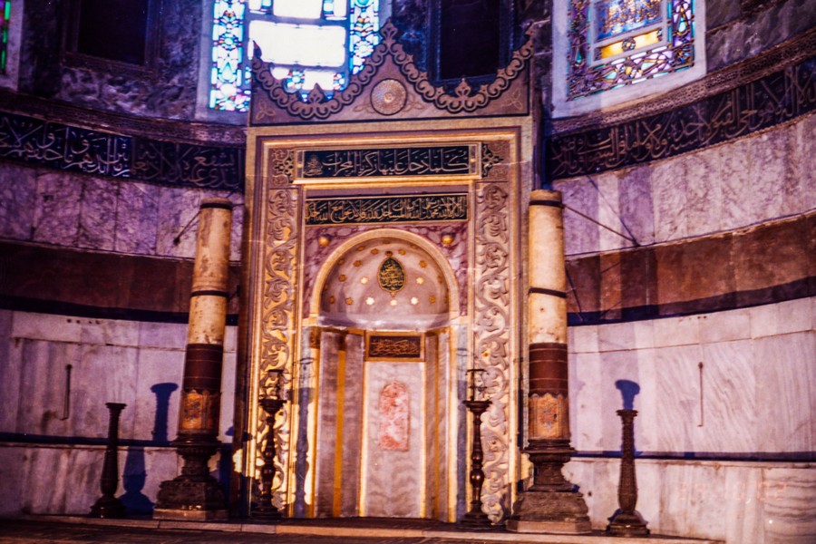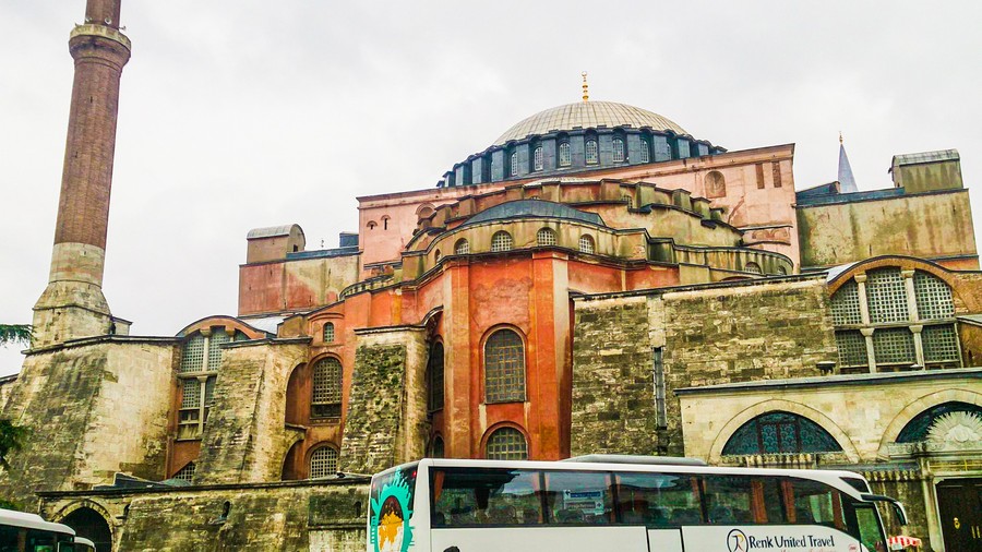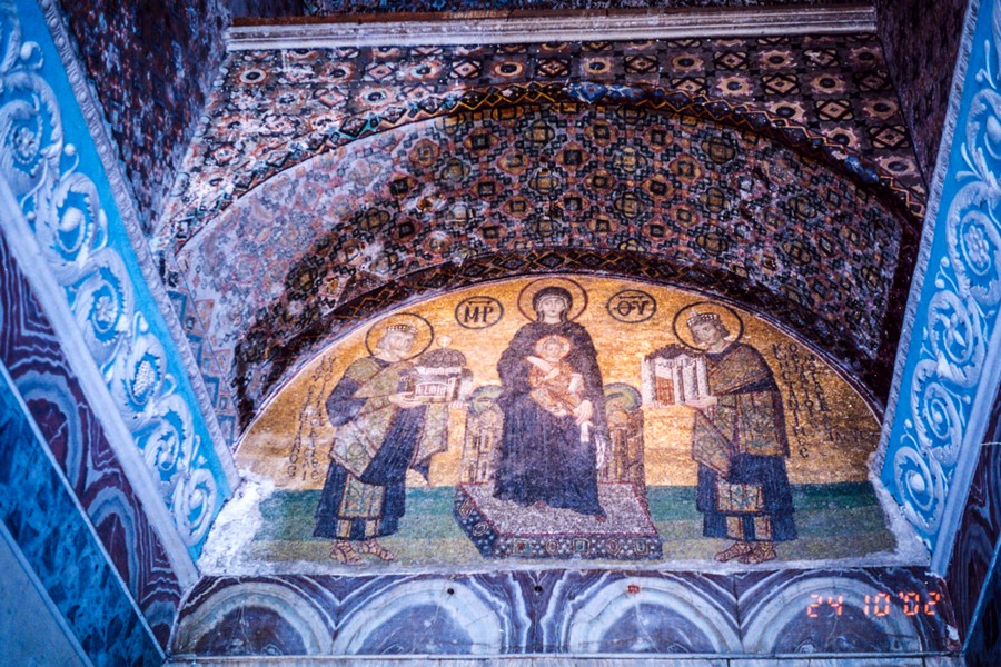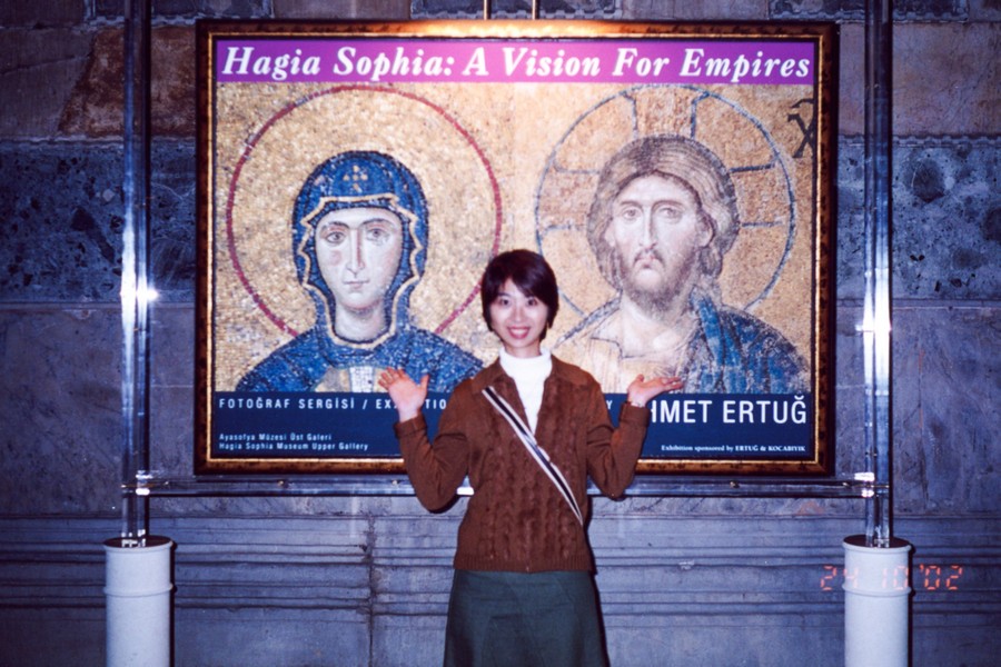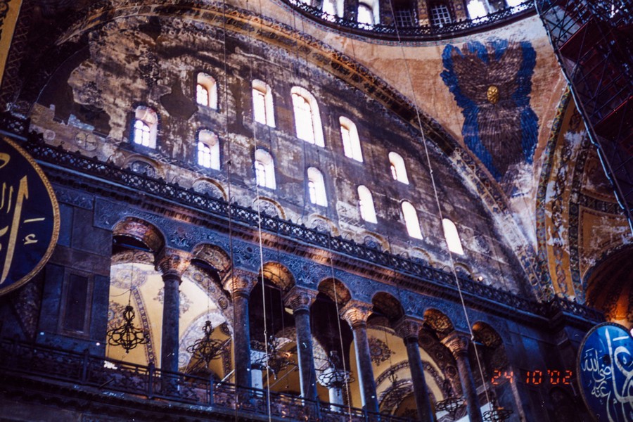 聖索菲亞博物館為拜占庭藝術的巔峰之作,希臘文sophia是指基督或神的智慧;君士坦丁大帝將基督教訂為國教,並於西元360年建造聖索菲亞教堂,西元404與414年兩次遭受火災,西元532年查士丁尼大帝將聖索菲亞教堂改建成全世界最大的教堂,他希望這座建築能夠雄偉到讓人們驚嘆於神的睿智;西元1453年鄂圖曼帝國征服君士坦丁堡,此時聖索菲亞教堂已在戰火的蹂躪下殘破不堪,後來被改建成伊斯蘭教清真寺,並增建四根宣禮塔,聖索菲亞從教堂變成清真寺,再變成現在兩教圖騰和平共存的模樣;1932年土耳其國父凱末爾將聖索菲亞改成博物館,也因此伊斯蘭教和基督教在此共和了。