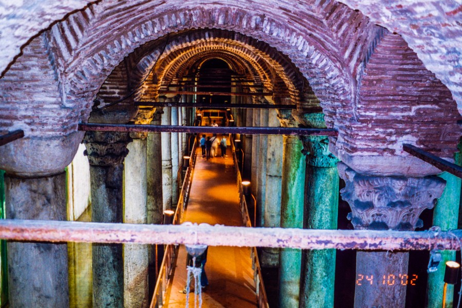 伊斯坦堡有數座像地下宮殿一樣的大型貯水池,這一座查士丁尼大帝時代(Justinian,西元527-565)所建造的眝水池,規模很大,長143公尺、寬65公尺、高9公尺的空間內,共有336根科林斯式大石柱,宛如一座地底的超級大宮殿,當年君士坦丁大帝動用了7000名奴隸才完成,試想一下這座位於市中心的奇妙空間,貯水量高達10萬噸;直到60年代法國考古學家發現它之前,老城的居民只是經常聽到水聲湧動,而在這個地底大洞還可以釣魚,真是不可思議。