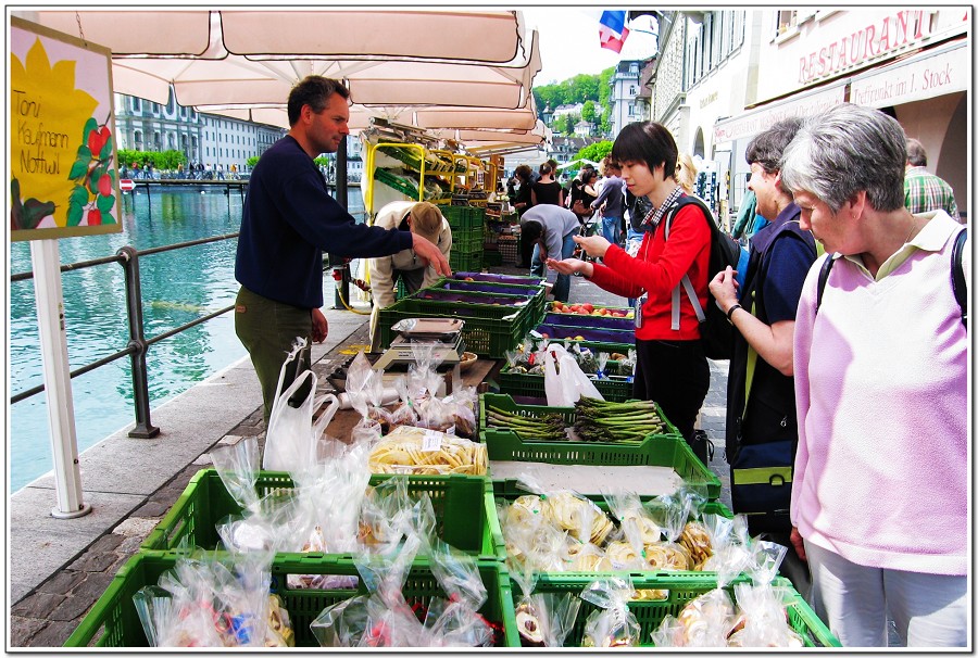 領隊小張告知中午要趕往鐵力士山,沒有供應午餐,山上的物價高昂,請我們先行準備午餐,於是暢遊風光美麗的「卡貝爾橋」後,在橋邊市集買了2盒草莓、火腿、法國麵包和硬麵包、乳酪、3串蕃茄、一串香蕉。