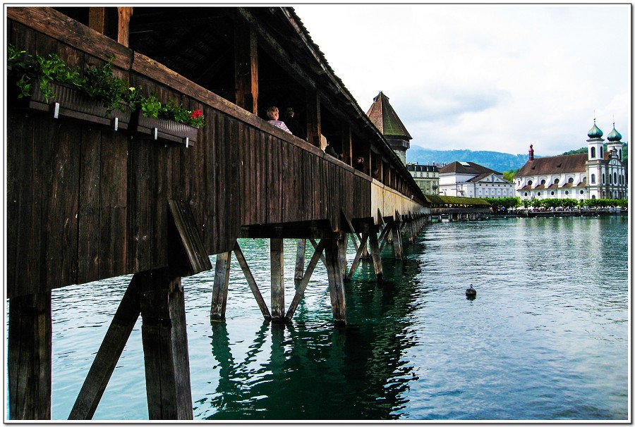 建於西元1333的「Chapel Bridge卡貝爾橋」。橫跨魯斯河,號稱歐洲最古老的木橋。