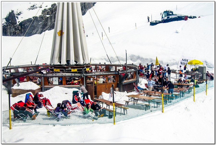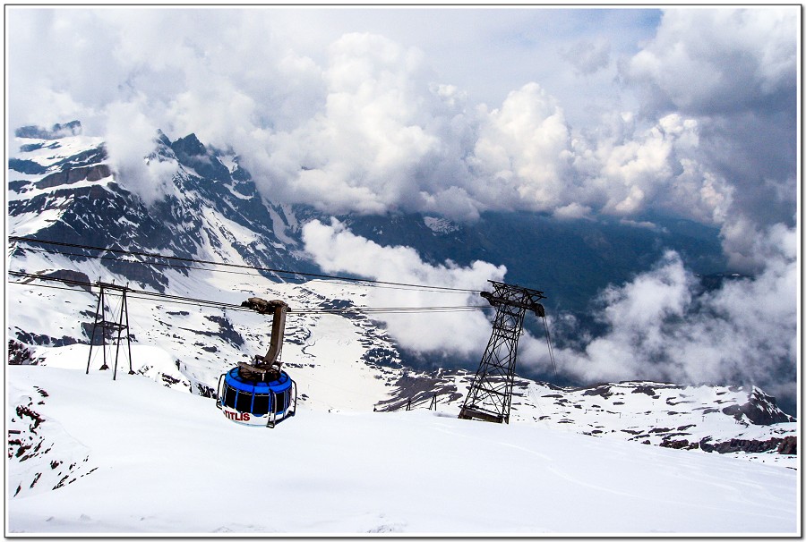 「鐵力士山」海拔3020公尺,這裡是瑞士中部最高峰,必須搭乘三段纜車上到山頂,因為纜車是不同私人公司,不同時期建造,所以有三段不同型式的纜車。首先搭乘一段四人座纜車,慢慢可以看到雪景,再轉乘一段可容納80人的大型纜車,已是白雪的山中,然後又得轉搭一種會360度旋轉的纜車,轉一圈剛好到達山頂。