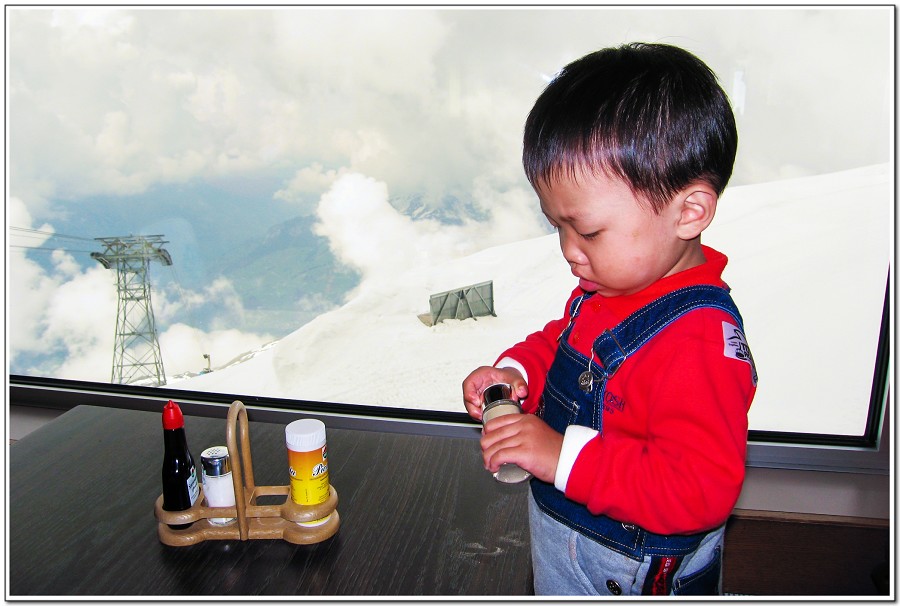 遠眺萬年冰河,雄偉壯麗的阿爾卑斯山景色、白白皚雪,風景的確不錯,隨便找遊客幫我拍照留念。