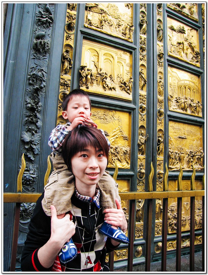 來到「比薩」一定會比一個雙手扶「比薩斜塔」的相片,奈何Eric吵著要吃披薩,根本不願意擺Pose,只好叫媽咪用「強」的方式亂拍一通,還是有幾張相片很有趣,例如有一張比薩斜塔要倒下來押到正在嚎啕大哭的Eric頭上,還有一張是一隻手頂著倒塌的斜塔,Eric死命地掙扎,有趣吧!