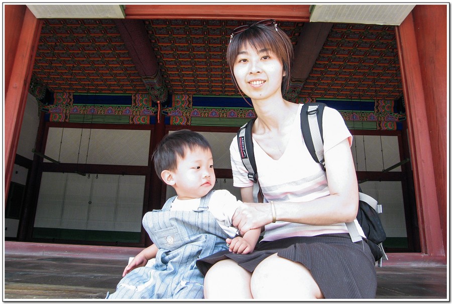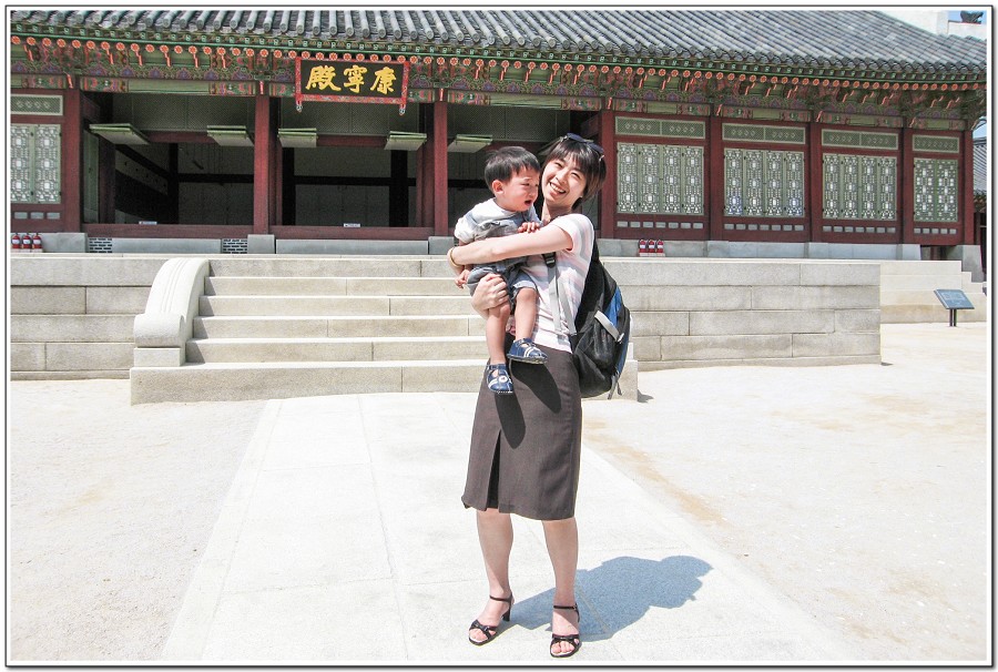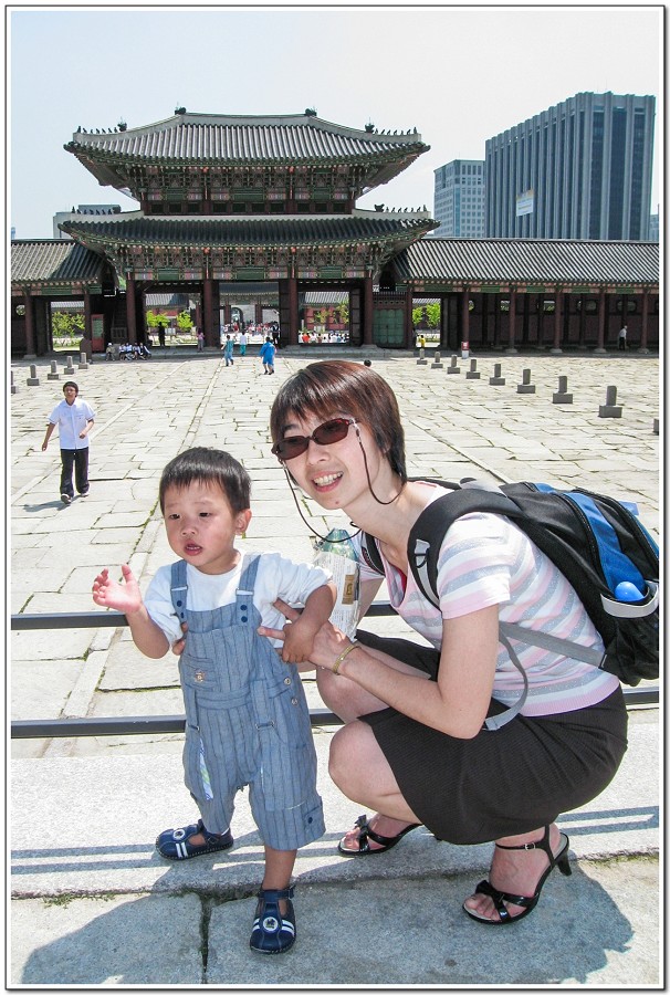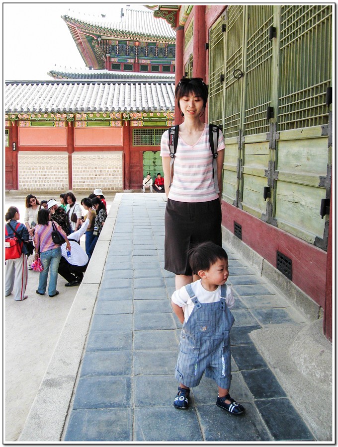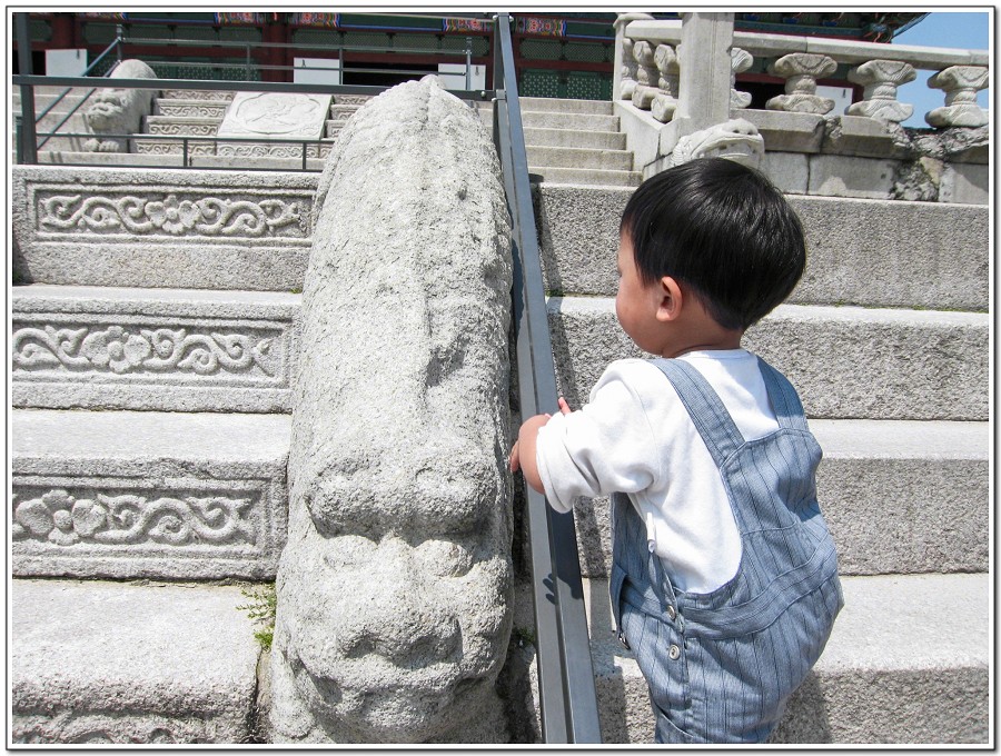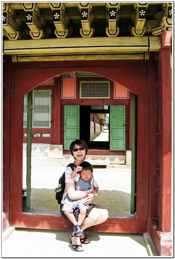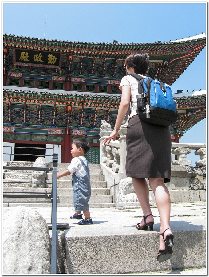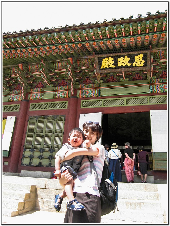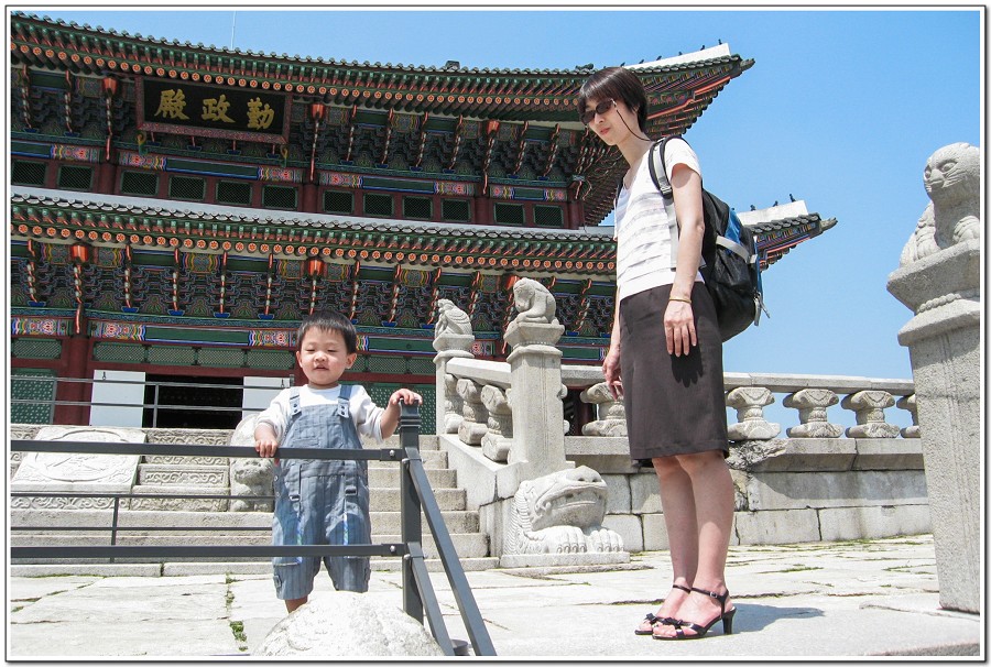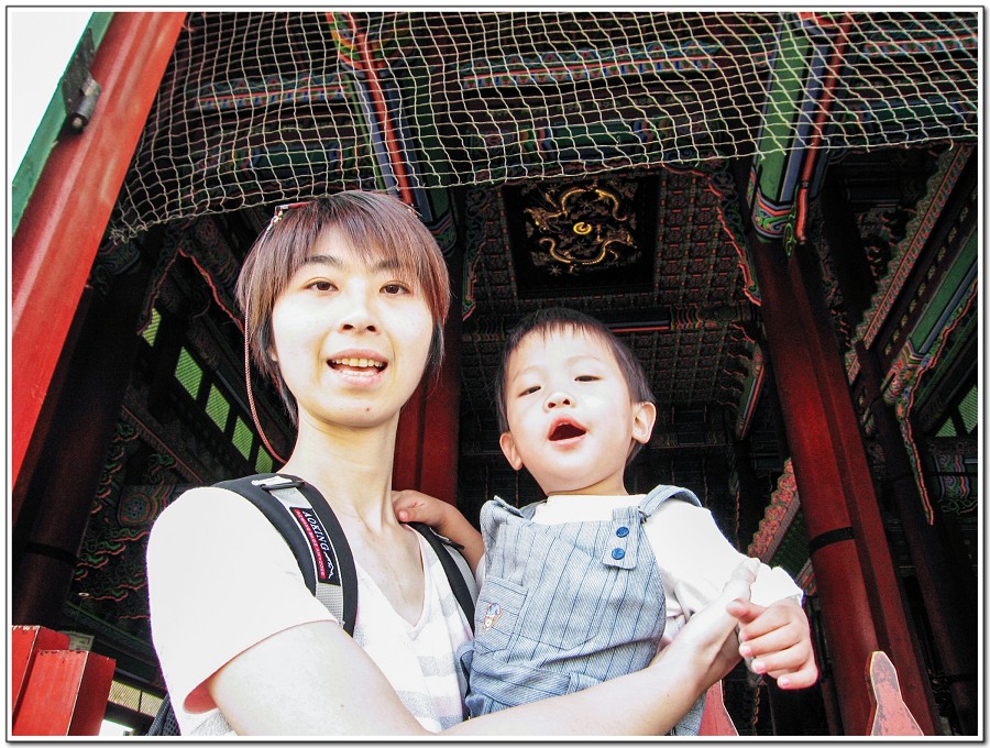 導遊說假如能與『勤政殿』屋頂上頭的金龍合照,那這個人就有皇帝命,所以韓國人用黑網將屋頂圍了一大圈,防止『真命天子』再出江湖!可是,我幫Eric和他娘成功地與金龍合照了一張,那不就表示Eric天生帝王命,將來會是一位王中之王囉!^_^