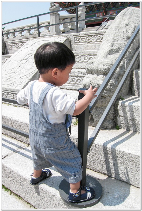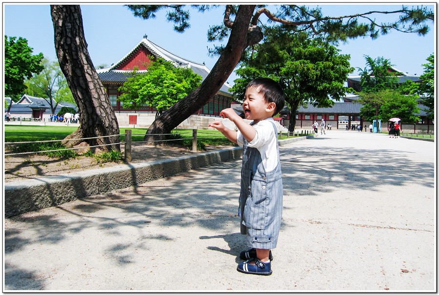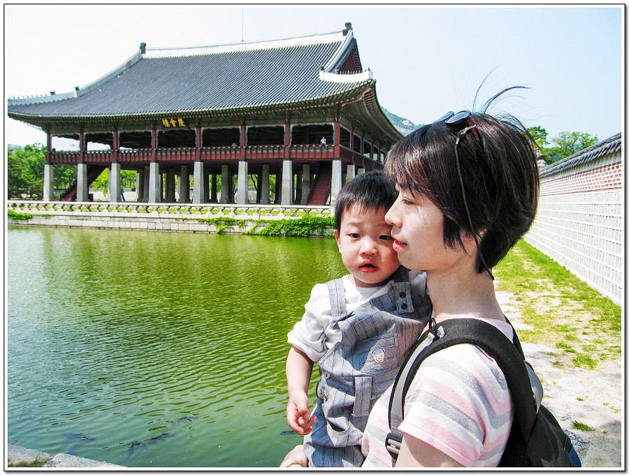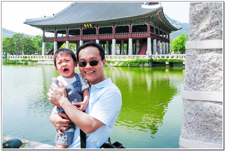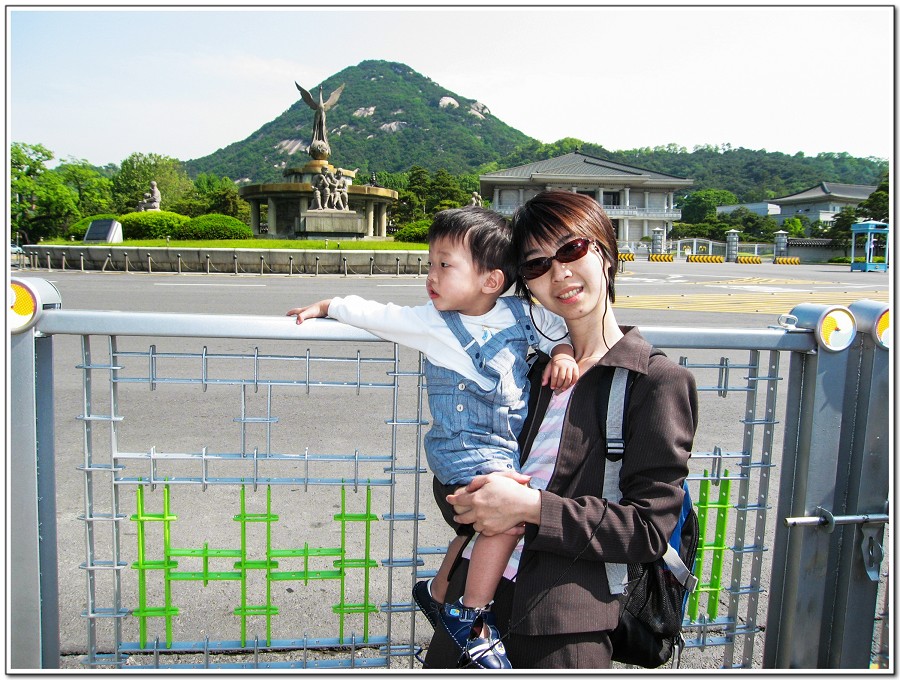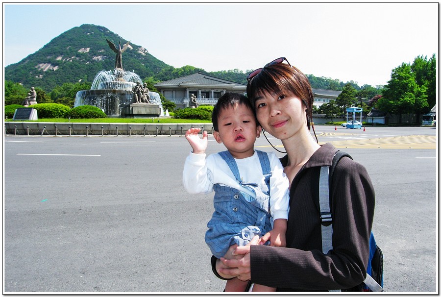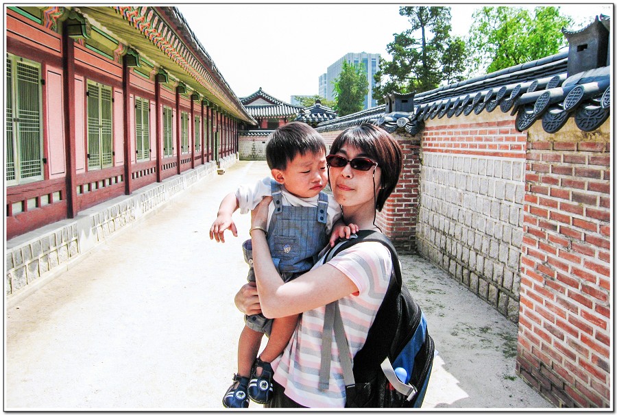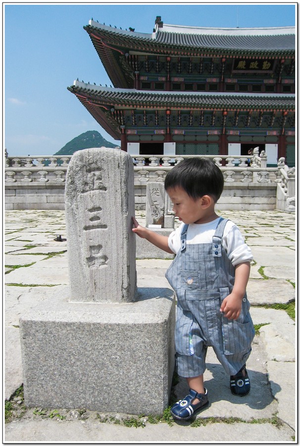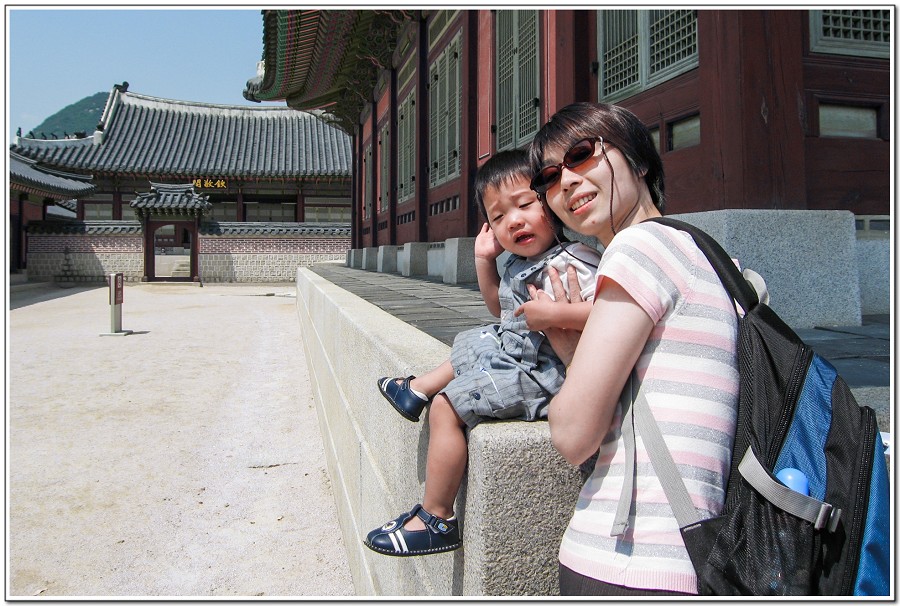 導遊說假如能與『勤政殿』屋頂上頭的金龍合照,那這個人就有皇帝命,所以韓國人用黑網將屋頂圍了一大圈,防止『真命天子』再出江湖!可是,我幫Eric和他娘成功地與金龍合照了一張,那不就表示Eric天生帝王命,將來會是一位王中之王囉!^_^