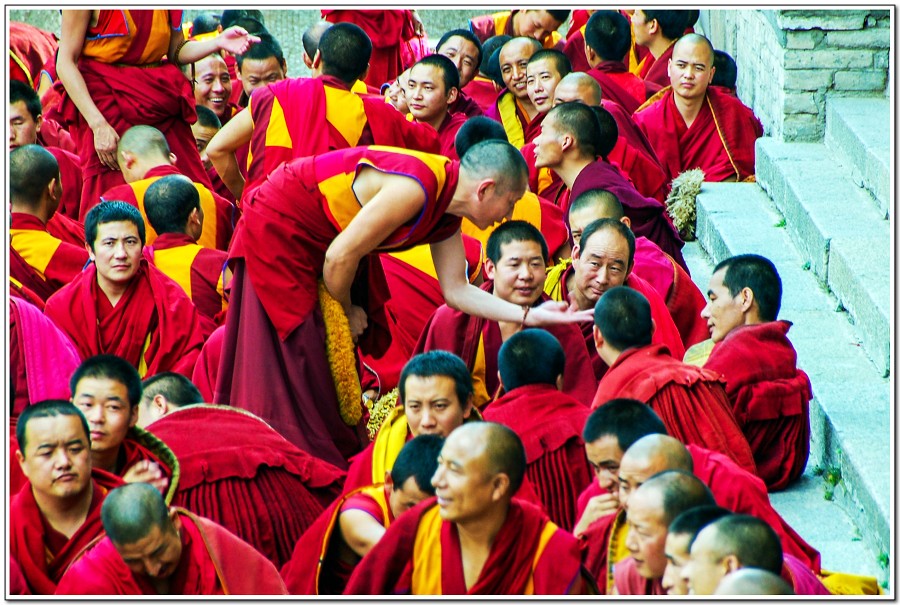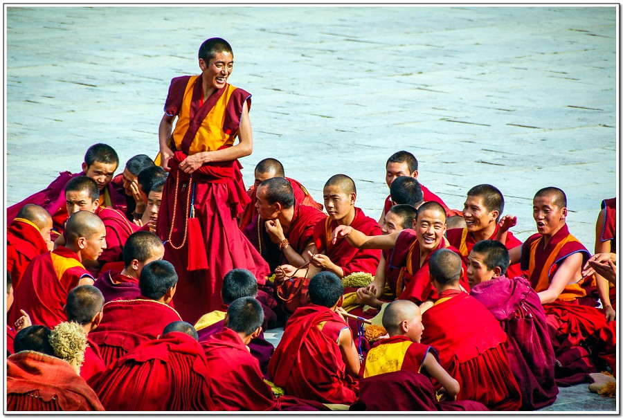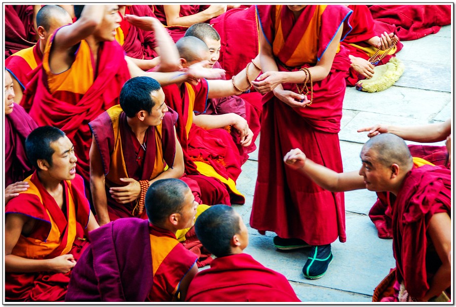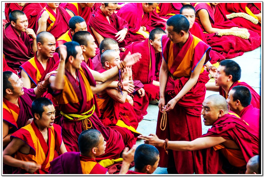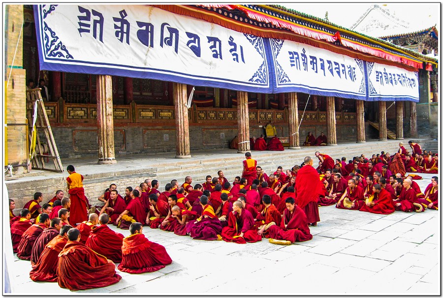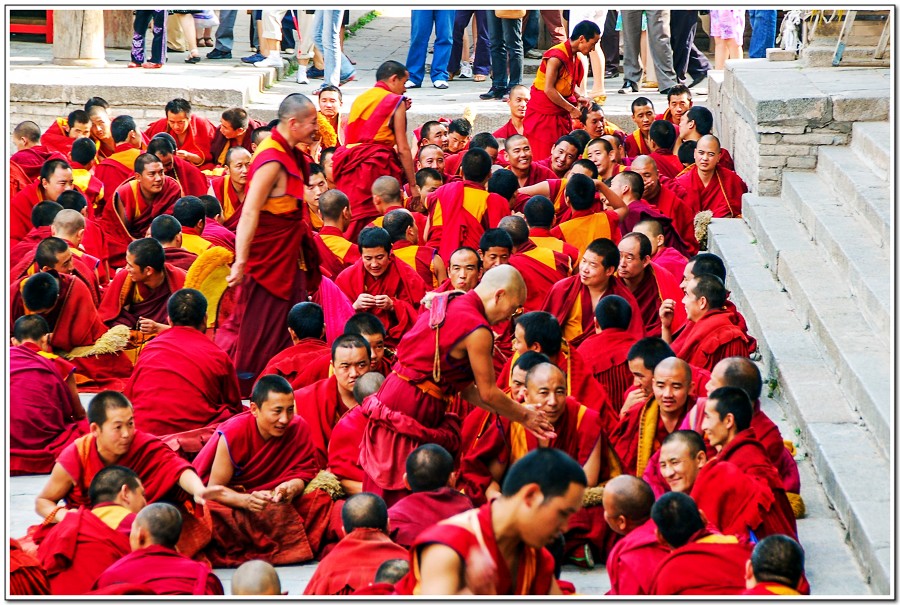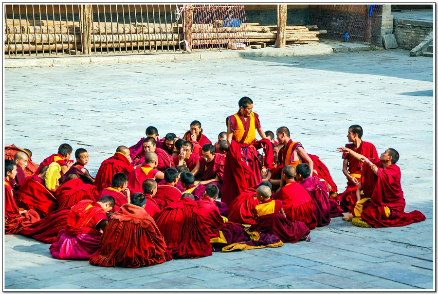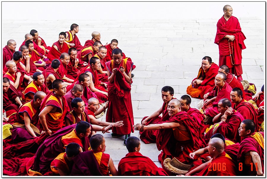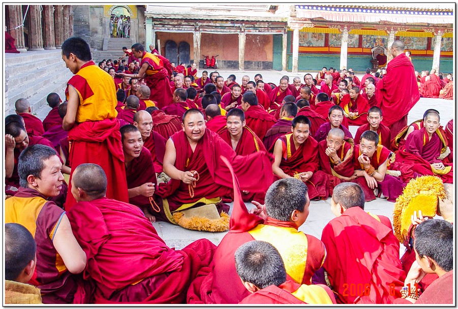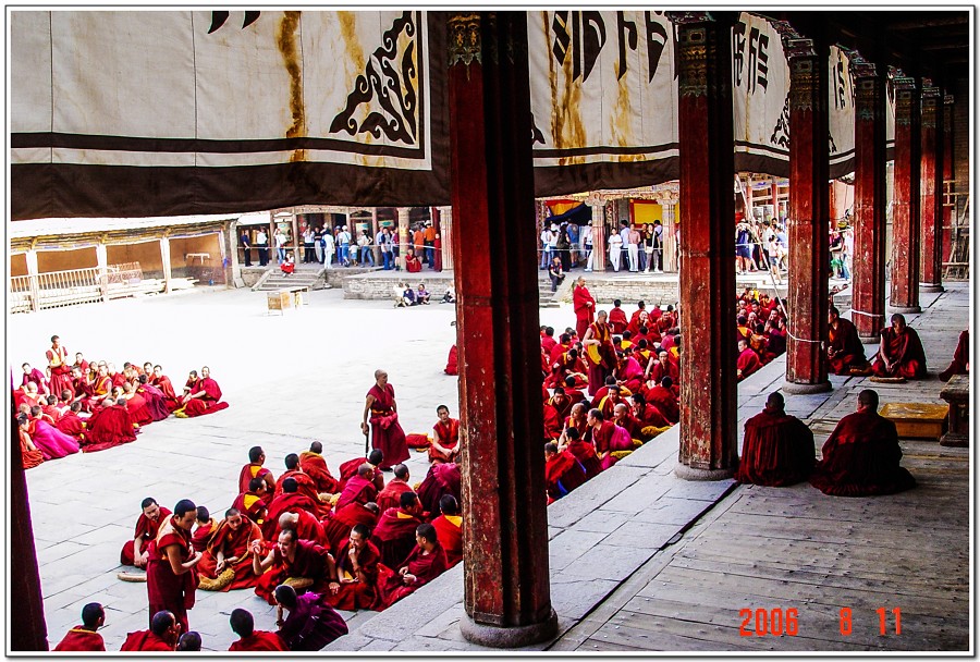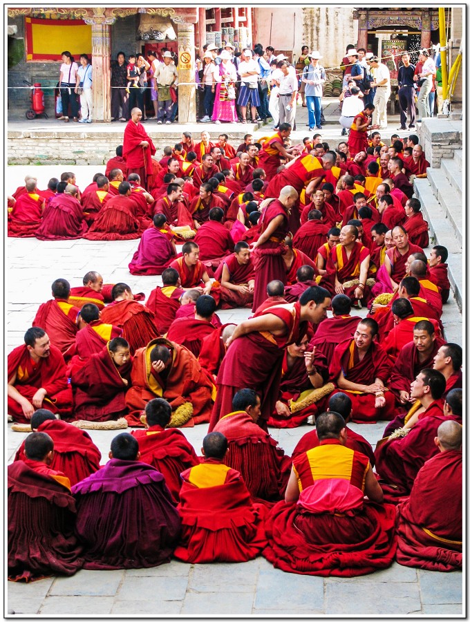廣場上的喇嘛正在進行『辯經』,類似學校的考試,坐著是主考官,學生滔滔不絕,不時以手擊掌,因為人數眾多,整個廣場轟轟然,煞是熱鬧有趣!