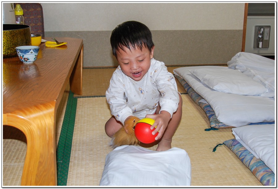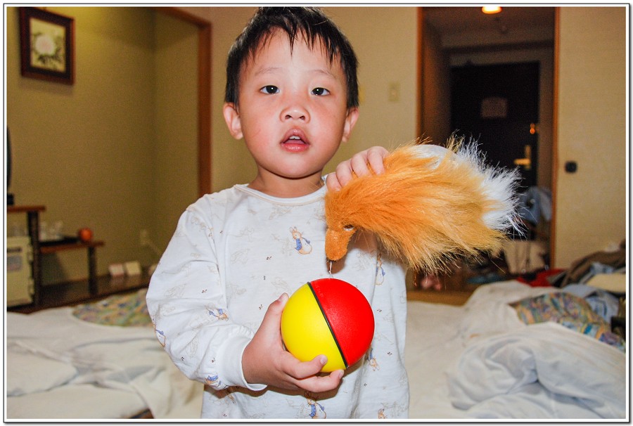 「函館山」買的狐狸追球玩具,讓Eric玩得很開心!