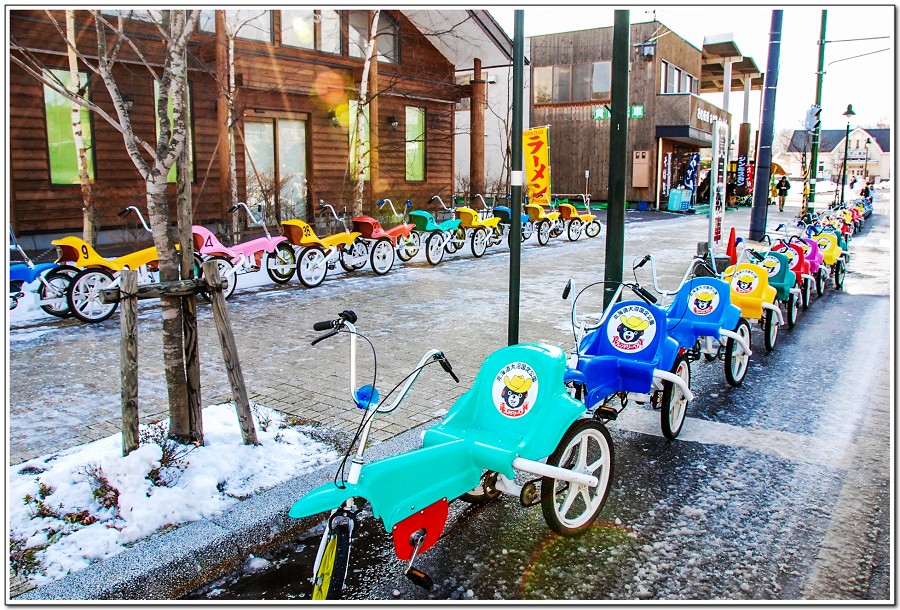 在「大沼」車站,Eric看到路邊一排彩色的三輪腳踏車,吵著要騎腳踏車玩。