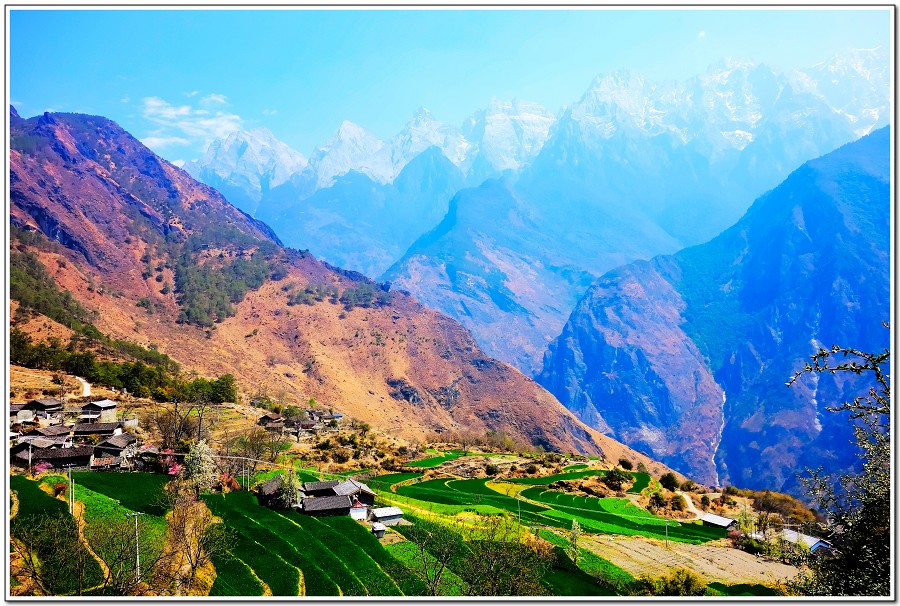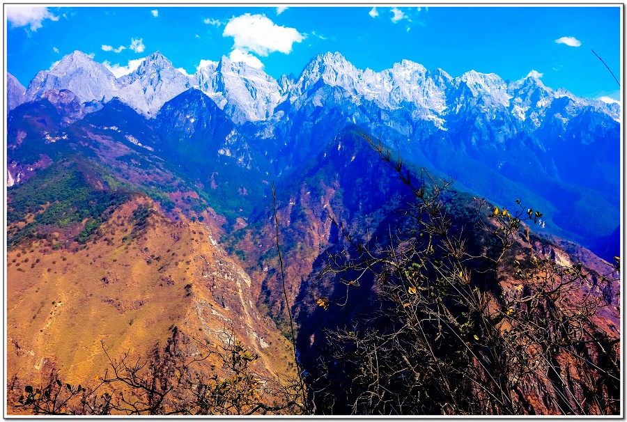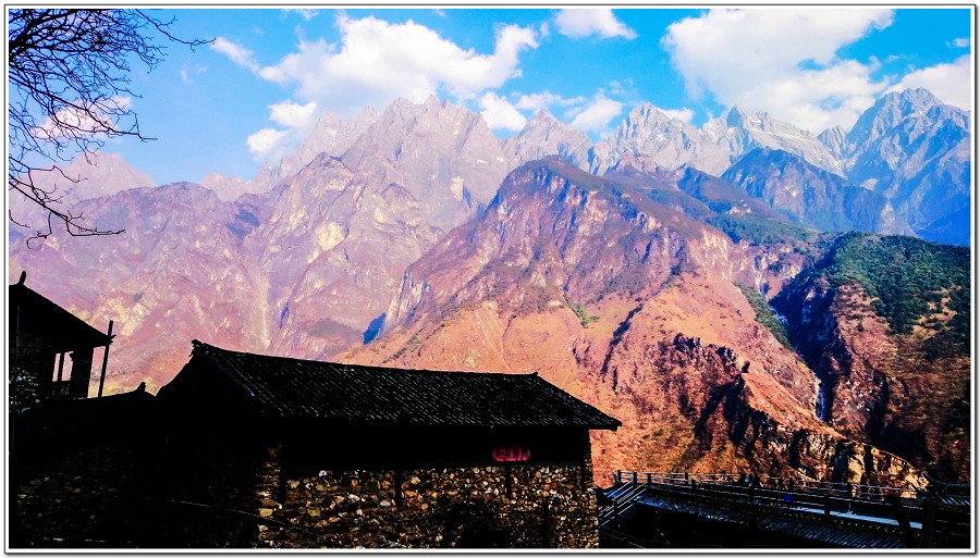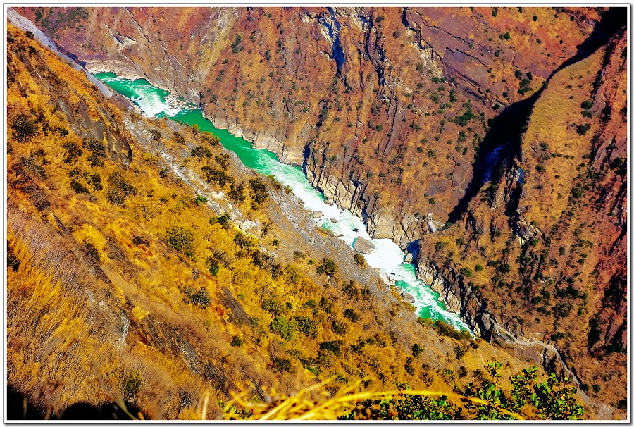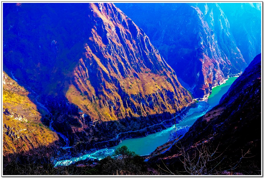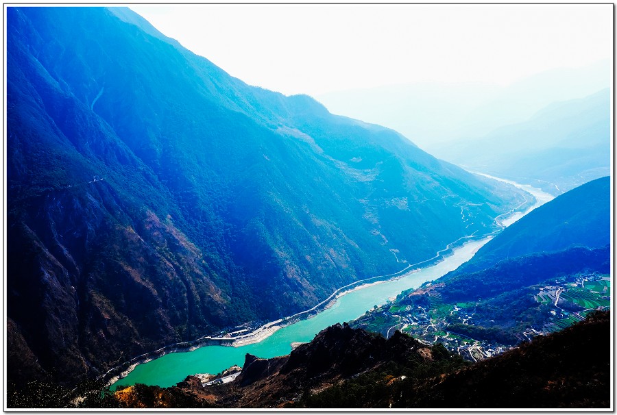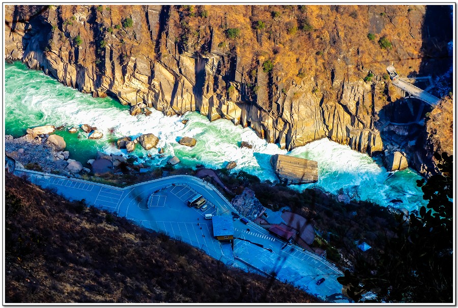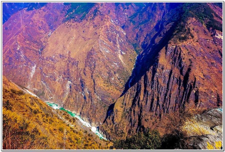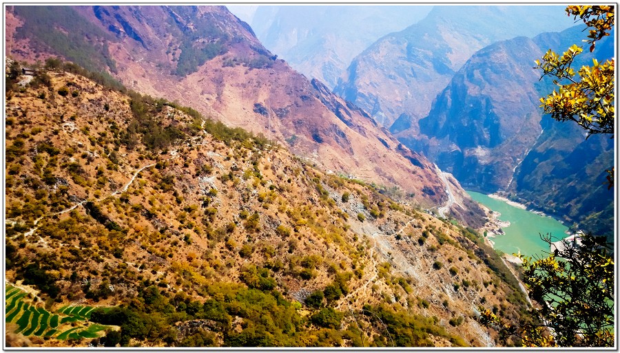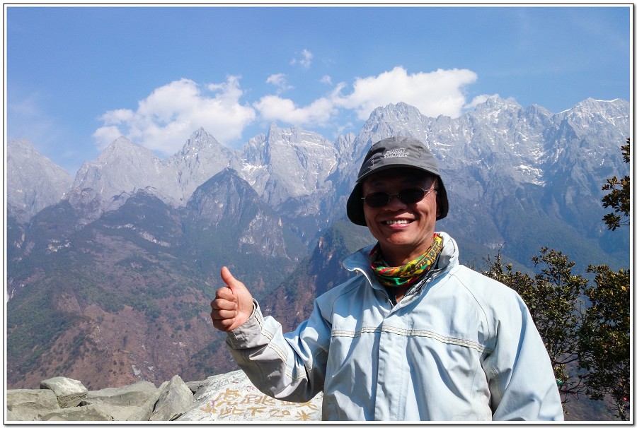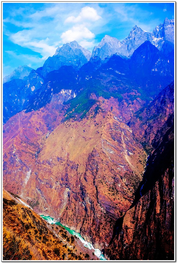 將鏡頭拉近一些,虎跳石清晰可見,也可以更明瞭金沙江哈巴雪山和玉龍雪山宛如一把利刃將蛋糕輕鬆切開兩塊後的山高谷深!^_^