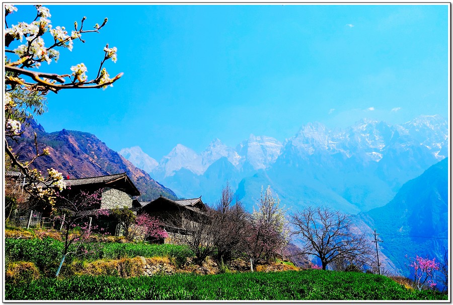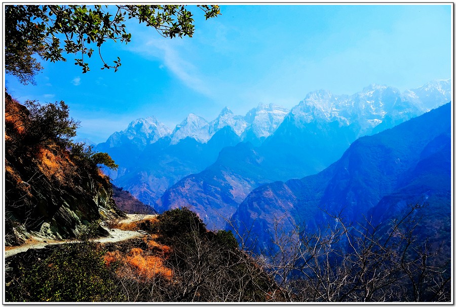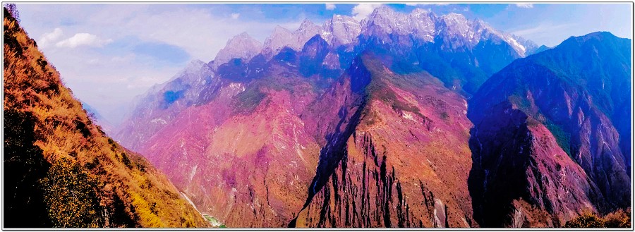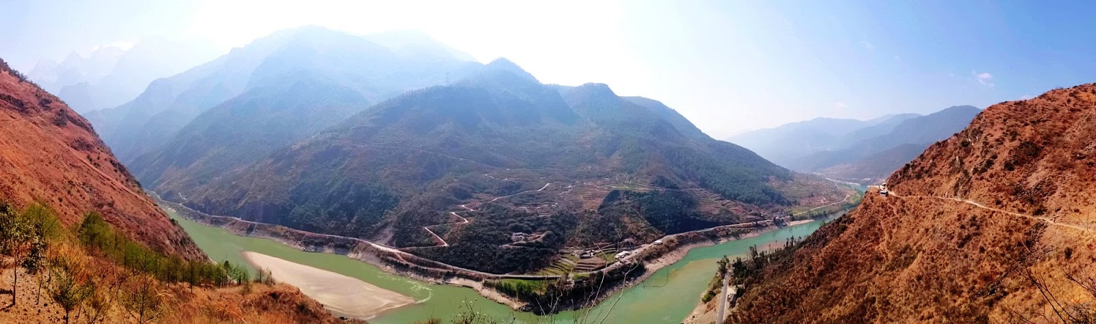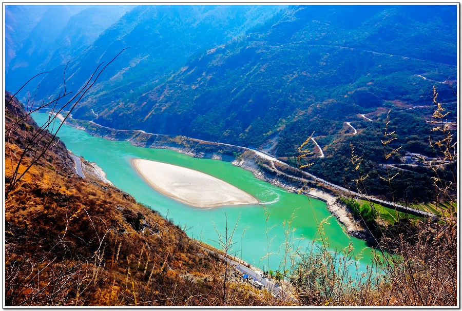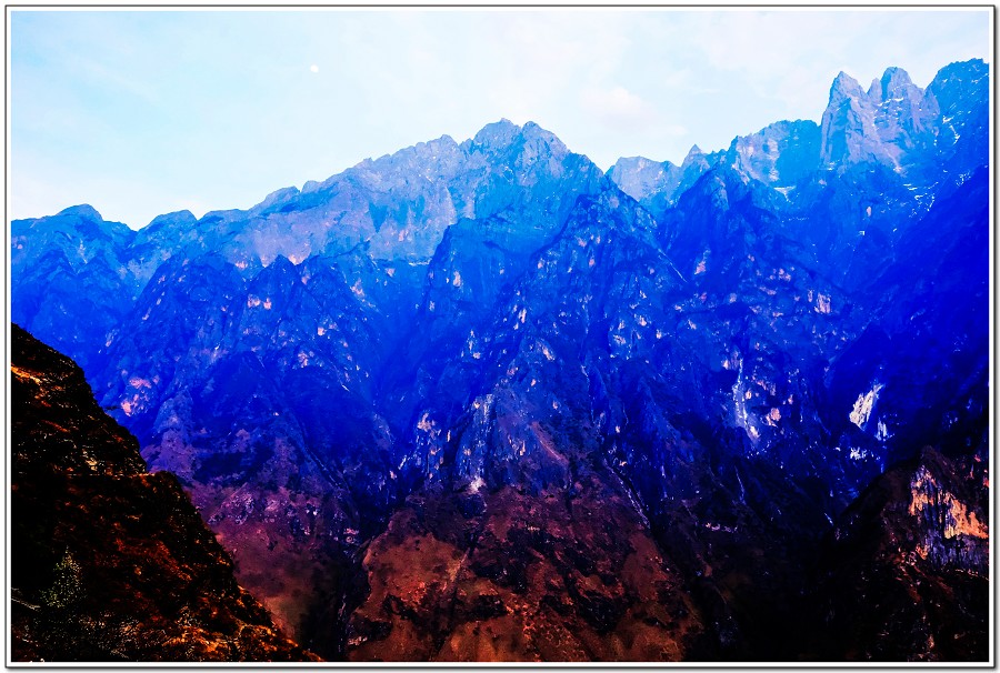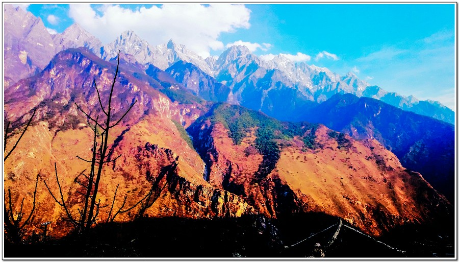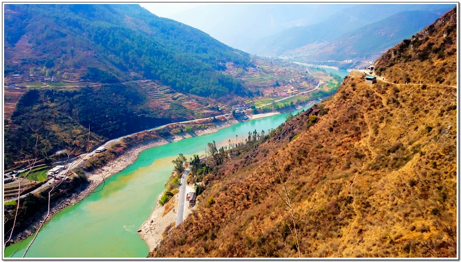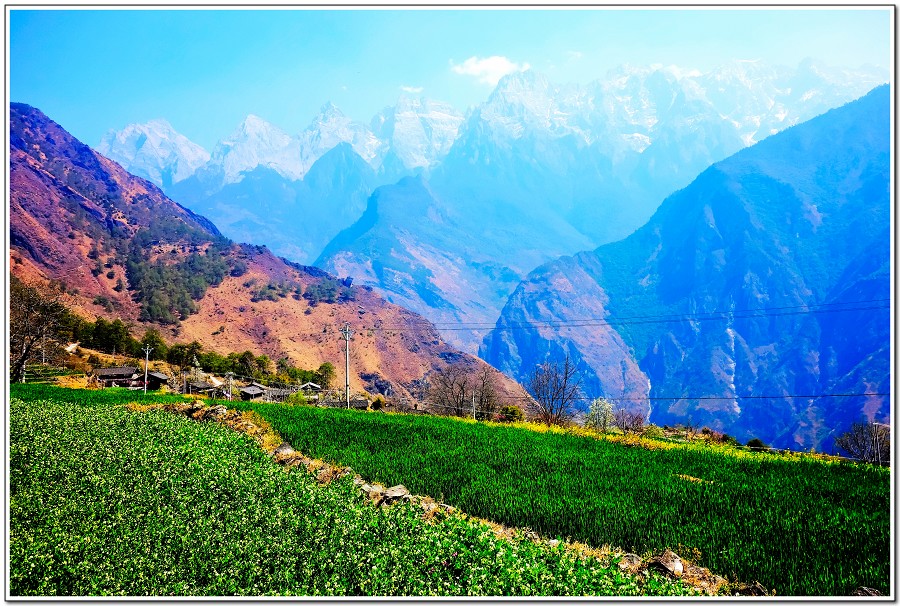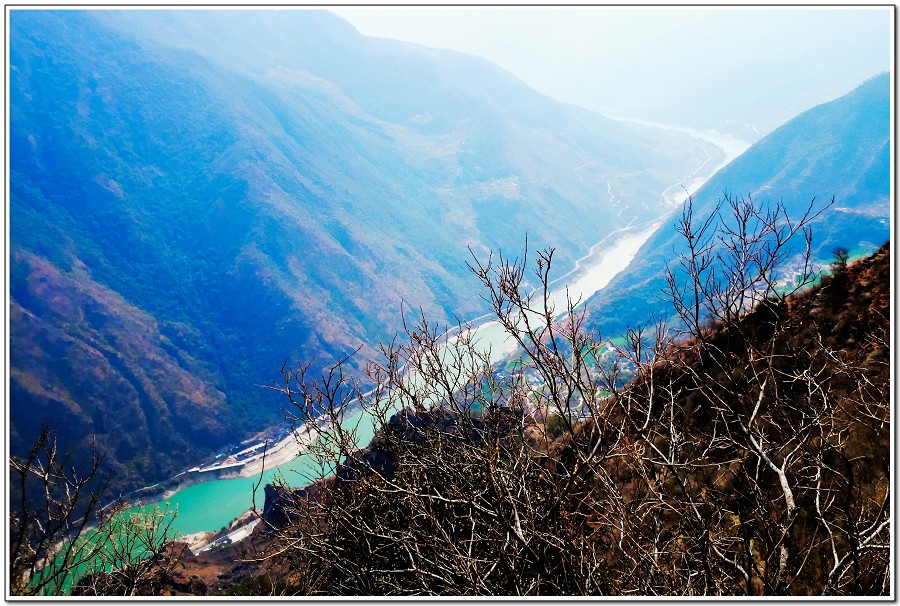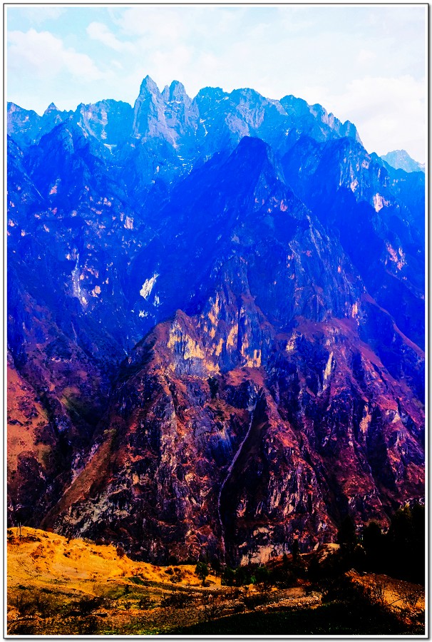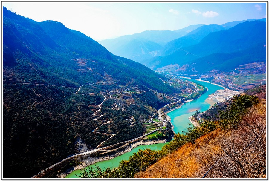 將鏡頭拉近一些,虎跳石清晰可見,也可以更明瞭金沙江哈巴雪山和玉龍雪山宛如一把利刃將蛋糕輕鬆切開兩塊後的山高谷深!^_^