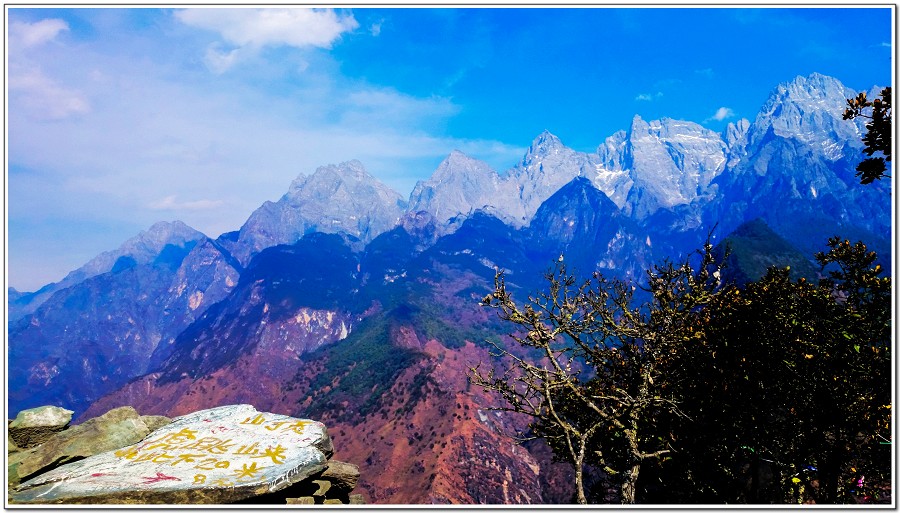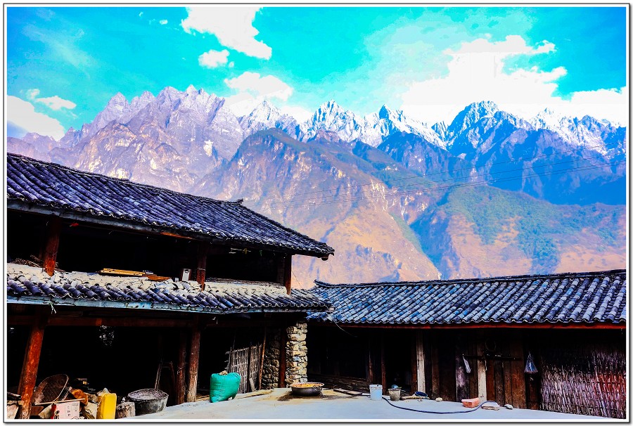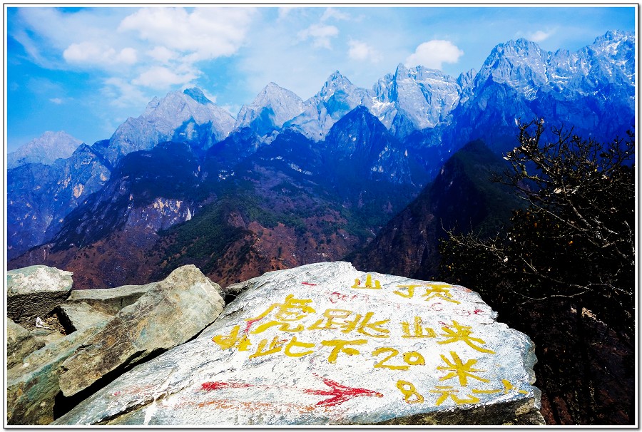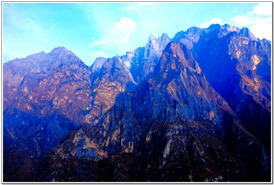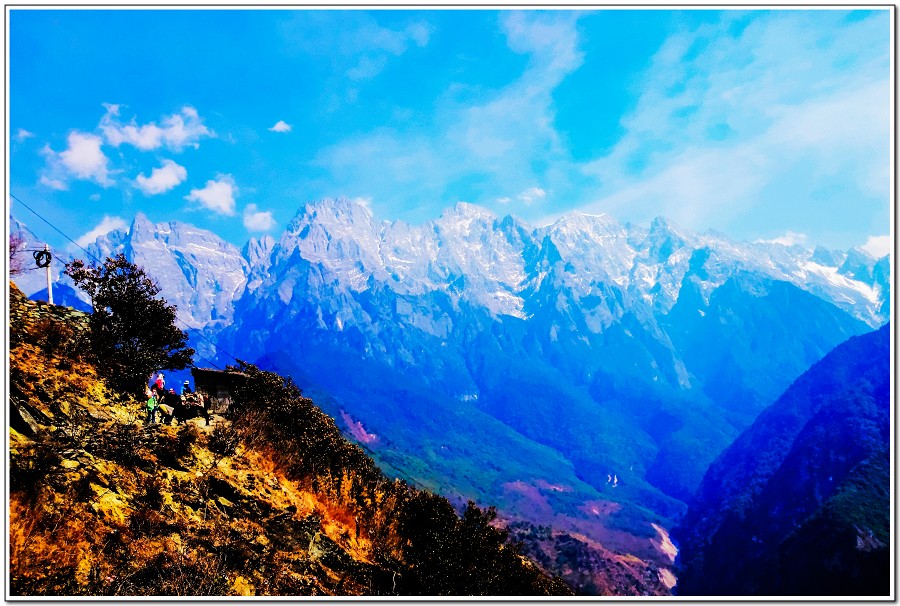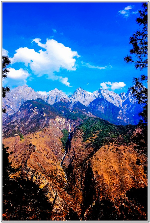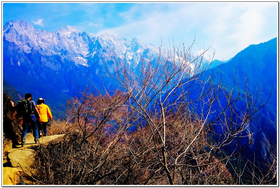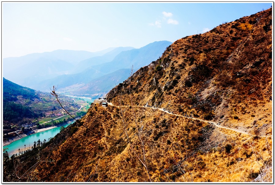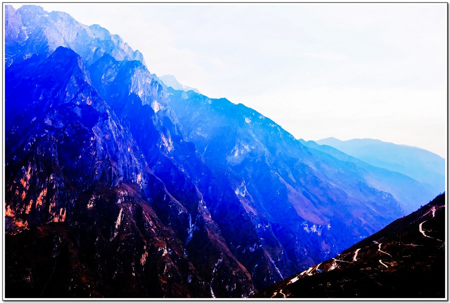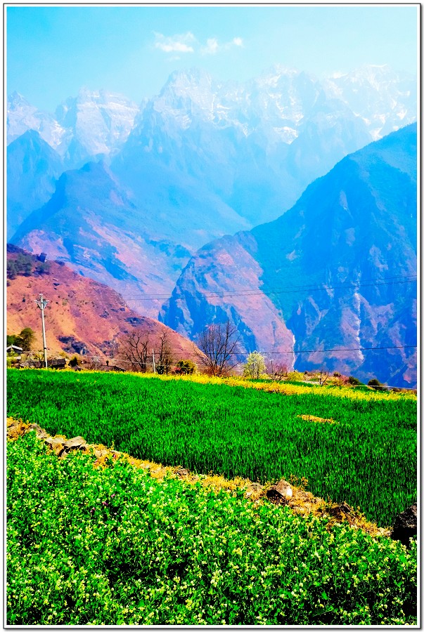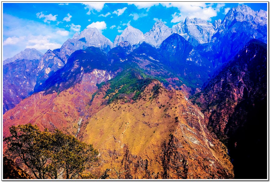 將鏡頭拉近一些,虎跳石清晰可見,也可以更明瞭金沙江哈巴雪山和玉龍雪山宛如一把利刃將蛋糕輕鬆切開兩塊後的山高谷深!^_^