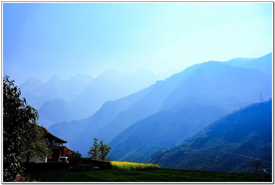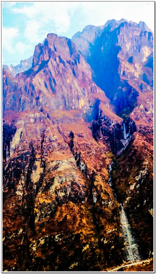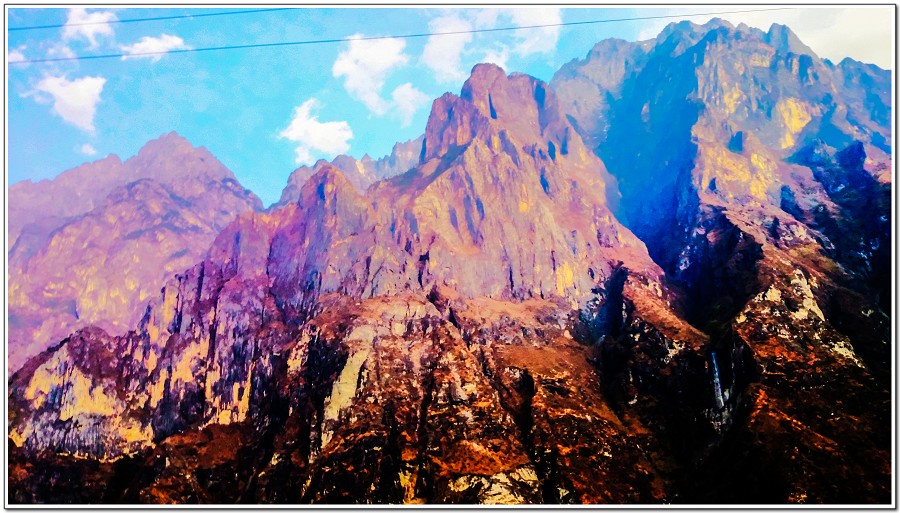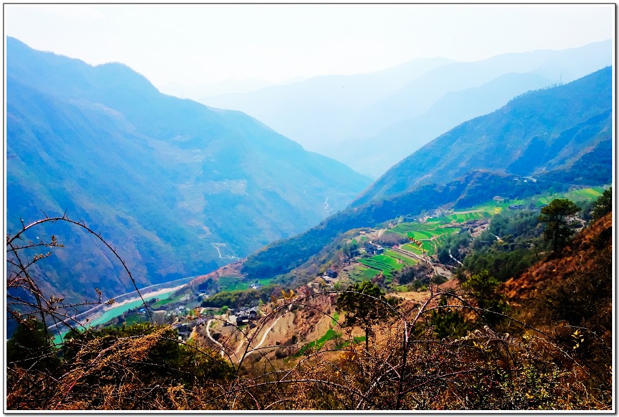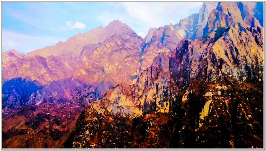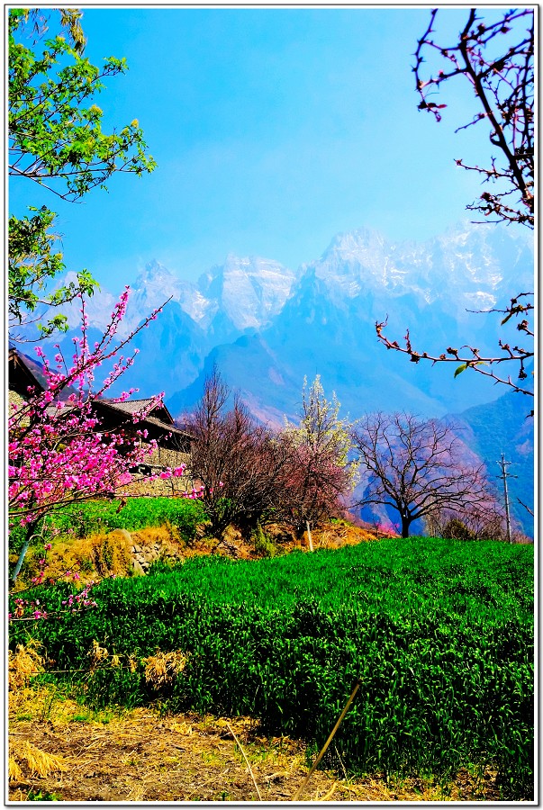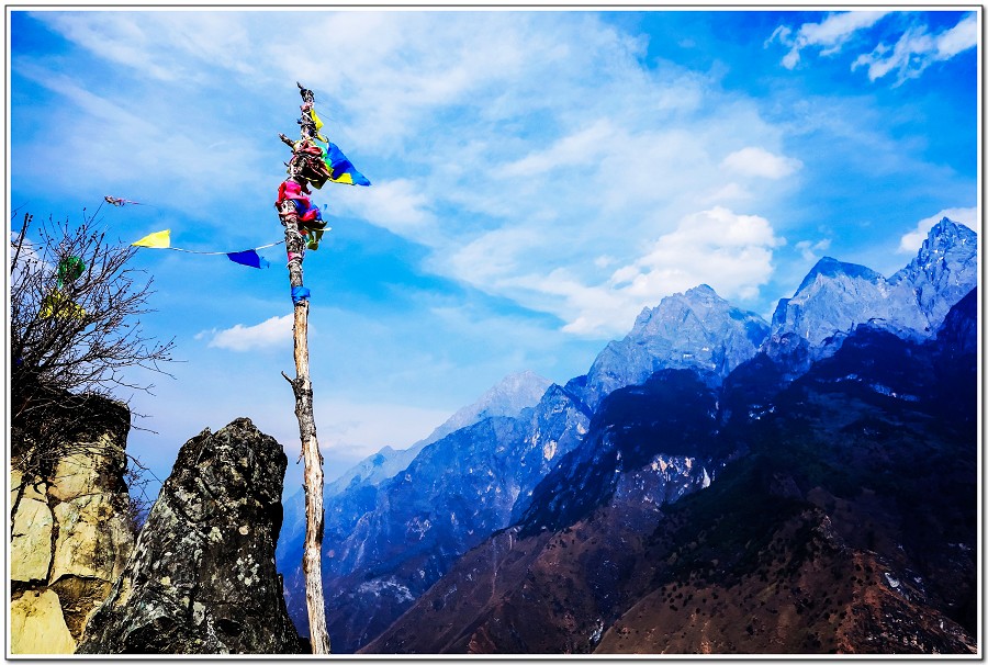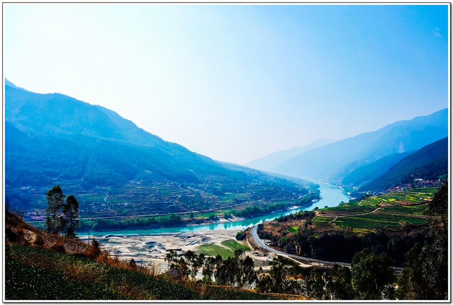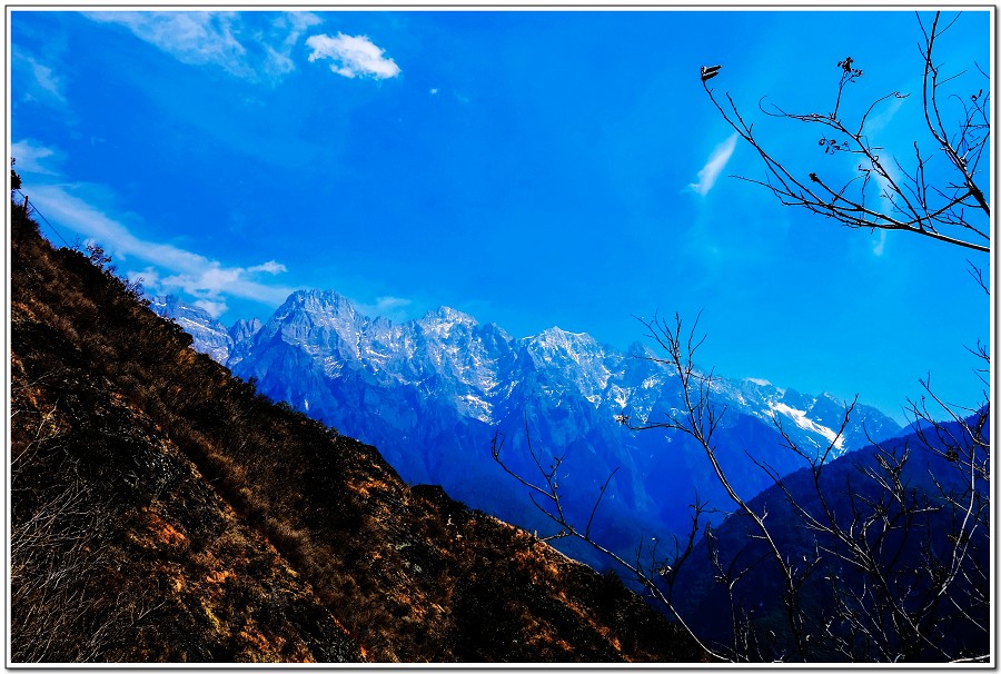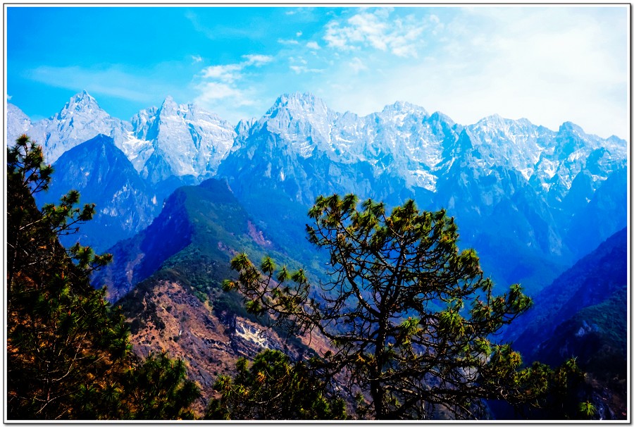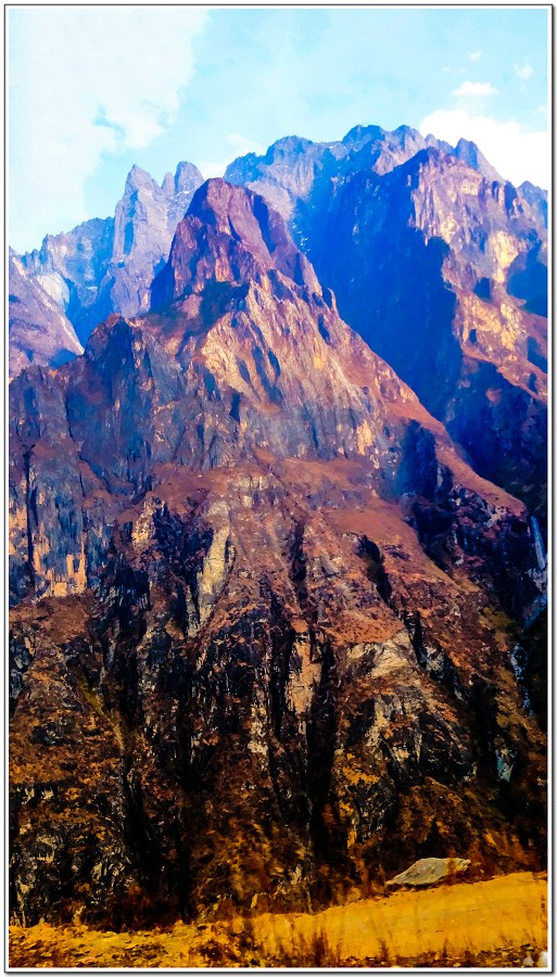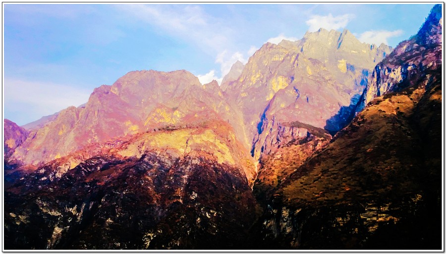 將鏡頭拉近一些,虎跳石清晰可見,也可以更明瞭金沙江哈巴雪山和玉龍雪山宛如一把利刃將蛋糕輕鬆切開兩塊後的山高谷深!^_^