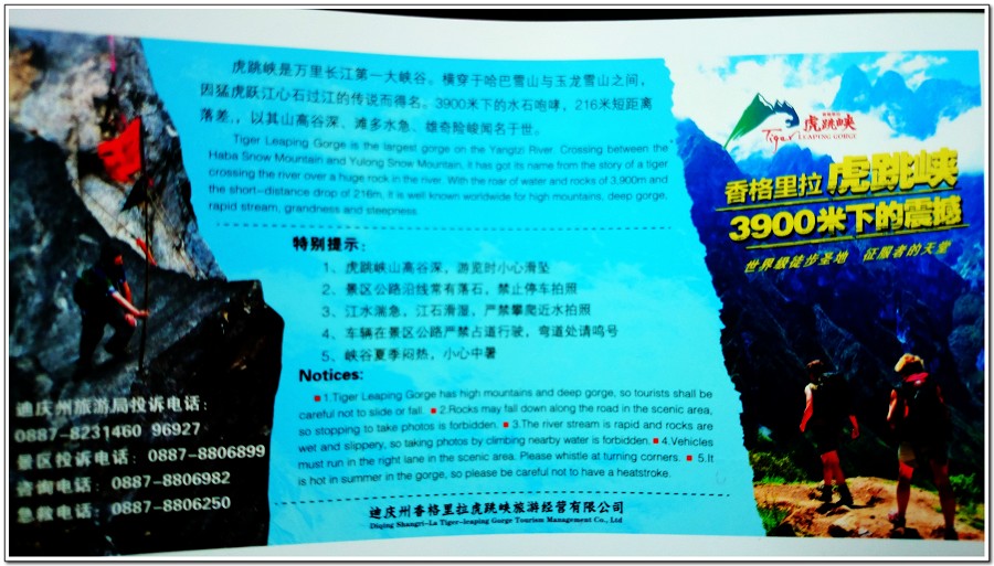 海報上頭寫著『虎跳峽萬里長江第一大峽谷,橫穿於哈巴雪山與玉龍雪山之間,因猛虎跳江心石過江的傳說而聞名,3900米下的水石咆哮,216米短距離落差,以其山高谷深、灘多水急雄奇險峻聞名於世!』