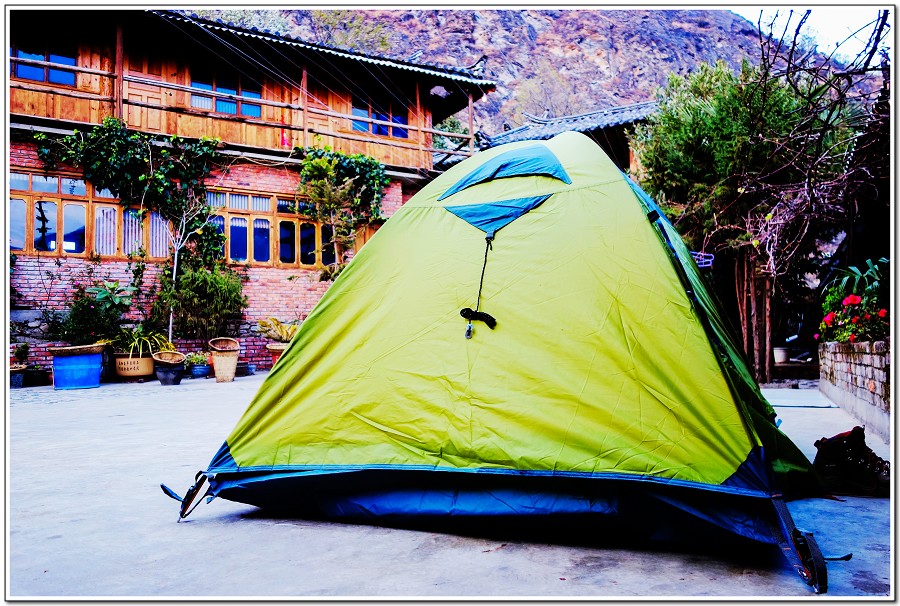 庭院中有人搭帳棚過夜,帳棚當然是是自己背來的,強!