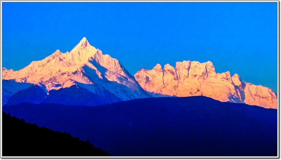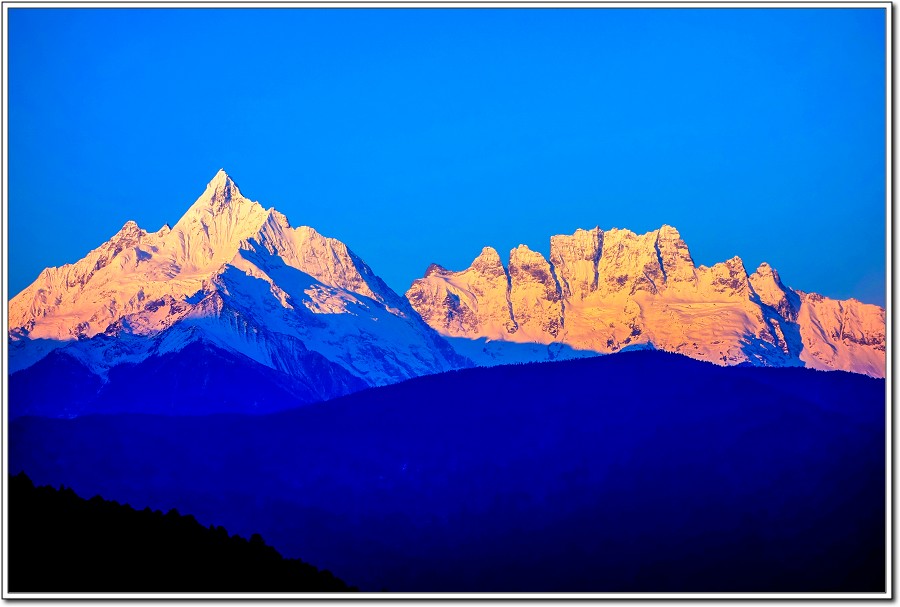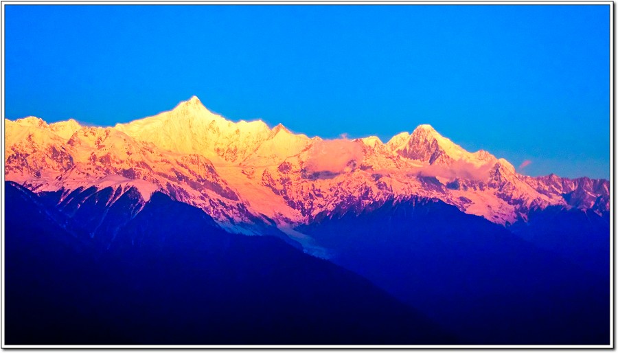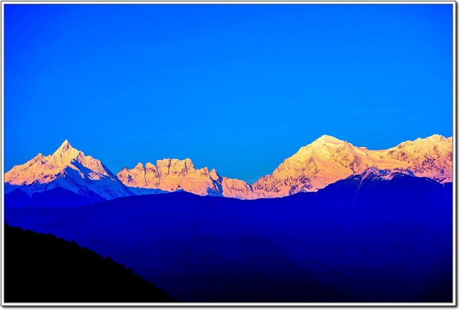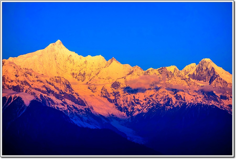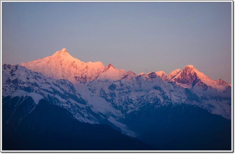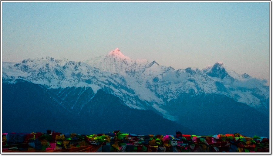 昨天傍晚在『飛來寺』覺色滇香國際青年旅社欣賞的梅里雪山黃昏被雲層所佔,大為失色,早上7點和Vivian、Kevin一起來到觀景台,領受梅里雪山日出之美!
