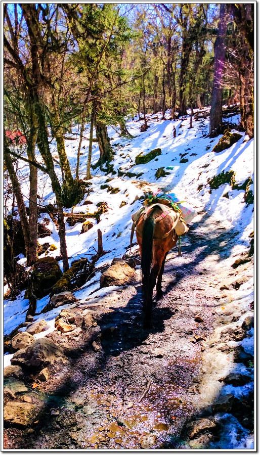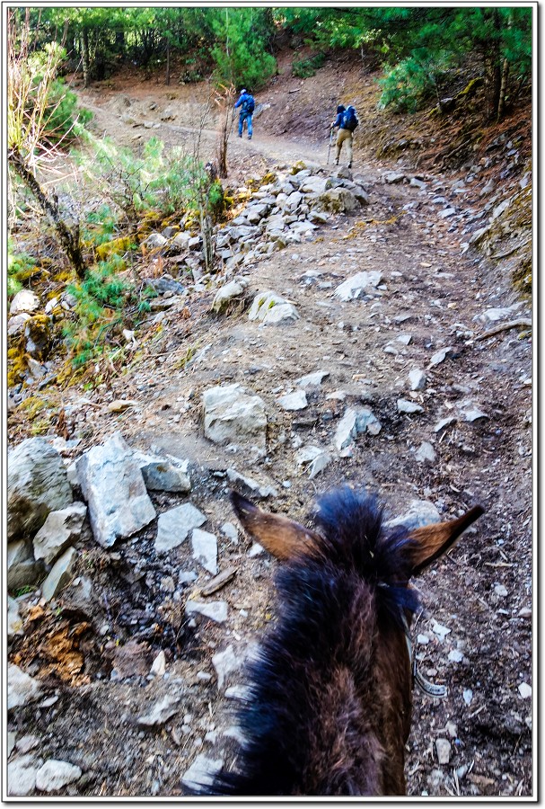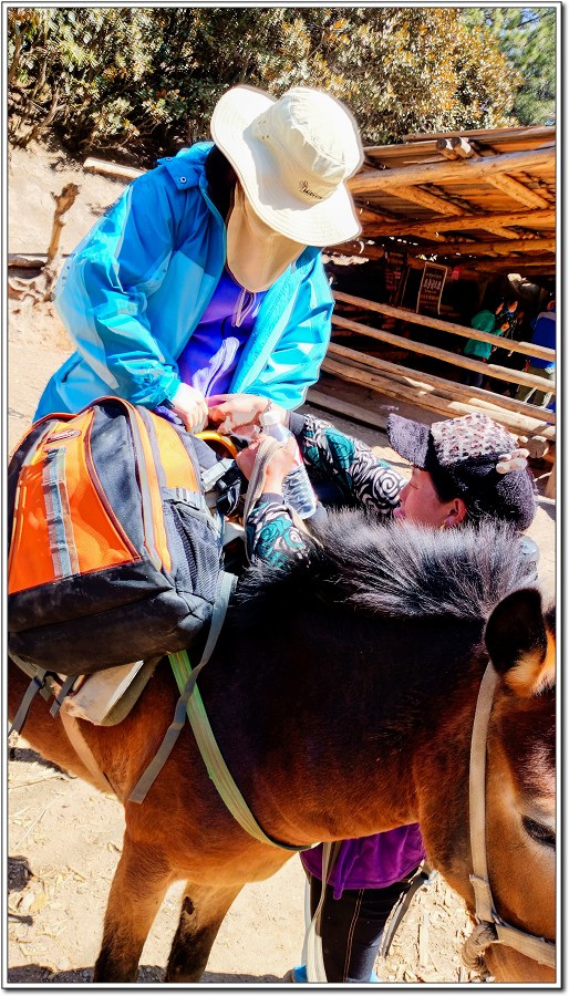 3天前走虎跳峽,路程太遠,老狼半途差點敗陣而亡,幸虧沿途可以花錢請馬伕提供馬匹將老狼駝上稜線。由於Kevin說雨崩這條路線從南宗啞口開始一路13度斜坡到啞口13公里,接著是6公里一路下坡直到雨崩村,路程19公里,老狼堅持在登山口就先騎馬節省體力。