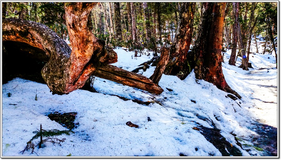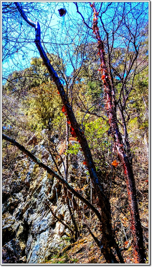 奇異的樹種,剝落的樹皮會變成血紅色,在陽光下彷彿遭受空難後一些乘客的髒東西拋灑在樹幹上!