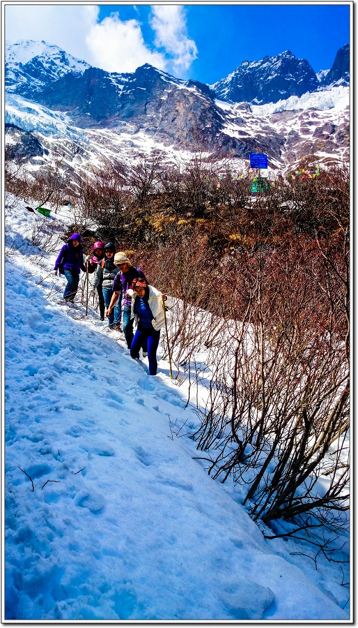 完成冰湖的大陸年輕人,她們都沒穿登山鞋也沒綁腿,也沒有登山仗,更沒冰爪,男男女女彼此唉唉叫路難行!